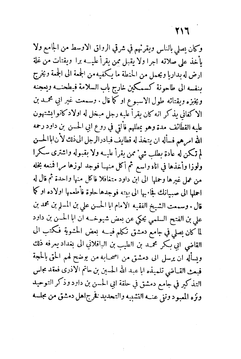 وَكَانَ يُصَلِّي بالنَّاس ويقرئهم فِي شَرْقي الرواق الْأَوْسَط من الْجَامِع وَلَا يَأْخُذ على صلَاته أجرا وَلَا يقبل مِمَّن يقْرَأ عَلَيْهِ برا ويقتات من غلَّة أَرض لَهُ بداريا وَيحمل من الْحِنْطَة مَا يَكْفِيهِ من الْجُمُعَة إِلَى الْجُمُعَة وَيخرج بِنَفسِهِ إِلَى طاحونة كسمكين خَارج بَاب السَّلامَة فيطحنه ويعجنه ويخبزه ويقتاته طول الْأُسْبُوع أَو كَمَا قَالَ وَسمعت غير أَبِي مُحَمَّد بن الْأَكْفَانِيِّ يذكر أَنه كَانَ يقْرَأ عَلَيْهِ رجل مبخل لَهُ أَوْلَاد كَانُوا يشتهون عَلَيْهِ القطائف مُدَّة وَهُوَ يمطلهم فألقي فِي روع أَبِي الْحسن بن دَاوُد رَحمَه اللَّه أَمرهم فَسَأَلَهُ أَن يتَّخذ لَهُ قطايف فبادر الرجل إِلَى ذَلِك لِأَن أَبَا الْحسن لم تكن لَهُ عَادَة بِطَلَب شَيْء مِمَّن يقْرَأ عَلَيْهِ وَلَا بقبوله وَاشْترى سكرا ولوزا وَأَخذهَا فِي إنَاء وَاسع ثمَّ أكل مِنْهَا فَوجدَ لوزها مرا فَمَنعه من عمل غَيرهَا وَحملهَا إِلَى ابْن دَاوُد متغافلا فَأكل مِنْهَا وَاحِدَة ثمَّ قَالَ لَهُ احملها إِلَى صبيانك فجَاء بهَا إِلَى بَيته فَوَجَدَهَا حلوة فأطعمها أَوْلَاده أَو كَمَا قَالَ وَسمعت الشَّيْخ الْفَقِيه الإِمَام أَبَا الْحسن عَليّ بْنَ الْمُسْلِمِ بْنِ مُحَمَّدِ بْنِ عَلِيِّ بْنِ الْفَتْح السّلمِيّ يَحْكِي عَن بعض شُيُوخه أَن أَبَا الْحسن بن دَاوُد لما كَانَ يُصَلِّي فِي جَامع دمشق تكلم فِيهِ بعض الحشوية فَكتب إِلَى الْقَاضِي أَبِي بكر مُحَمَّد بن الطّيب بن الباقلاني إِلَى بَغْدَاد يعرفهُ ذَلِك ويسأله أَن يُرْسل إِلَى دمشق من أَصْحَابه من يُوضح لَهُم الْحق بِالْحجَّةِ فَبعث الْقَاضِي تِلْمِيذه أَبَا عَبْد اللَّهِ الْحُسَيْن بن حَاتِم الْأَزْدِيّ فعقد مجْلِس التَّذْكِير فِي جَامع دمشق فِي حَلقَة أَبِي الْحسن بن دَاوُد وَذكر التَّوْحِيد ونزه المعبود وَنفى عَنهُ التَّشْبِيه والتحديد فَخرج أهل دمشق من مَجْلِسه