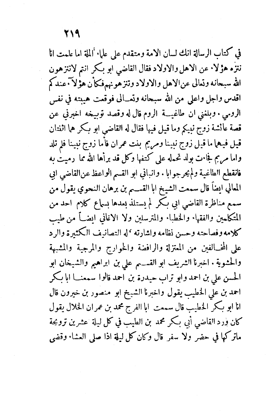 فِي كتاب الرسَالَة إِنَّك لِسَان الْأمة ومتقدم على عُلَمَاء الْملَّة أما علمت أنَا ننزه هَؤُلَاءِ عَن الْأَهْل وَالْأَوْلَاد فَقَالَ الْقَاضِي أَبُو بكر أَنْتُم لَا تنزهون اللَّه سُبْحَانَهُ وَتَعَالَى عَن الْأَهْل وَالْأَوْلَاد وتنزهزنهم فَكَانَ هَؤُلَاءِ عنْدكُمْ أقدس وَأجل وَأَعْلَى من اللَّه سُبْحَانَهُ وَتَعَالَى فَوَقَعت هيبته فِي نفس الرُّومِي وَبَلغنِي أَن طاغية الرّوم قَالَ لَهُ وَقصد توبيخه أَخْبَرنِي عَن قصَّة عَائِشَة زوج نَبِيكُم وَمَا قيل فِيهَا فَقَالَ لَهُ الْقَاضِي أَبُو بكر هما اثْنَتَانِ قيل فيهمَا مَا قيل زوج نبينَا وَمَرْيَم بنت عمرَان فَأَما زوج نبينَا فَلم تَلد وَأما مَرْيَم فَجَاءَت بِولد تحمله على كتفها وكل قد برأها اللَّه مِمَّا رميت بِهِ فَانْقَطع الطاغية وَلم يحر جَوَابا وأنبأني أَبُو الْقسم الْوَاعِظ عَن الْقَاضِي أَبِي الْمَعَالِي أَيْضا قَالَ سَمِعت الشَّيْخ أَبَا الْقسم بن برهَان النَّحْوِيّ يَقُول من سمع منَاظرة الْقَاضِي أَبِي بكر لم يستلذ بعْدهَا بِسَمَاع كَلَام أحد من الْمُتَكَلِّمين وَالْفُقَهَاء والخطباء والمترسلين وَلَا الأغاني أَيْضا من طيب كَلَامه وفصاحته وَحسن نظامه وإشارته لَهُ التصانيف الْكَثِيرَة وَالرَّدّ على الْمُخَالفين من الْمُعْتَزلَة والرافضة والخوارج والمرجية والمشبهة والحشوي