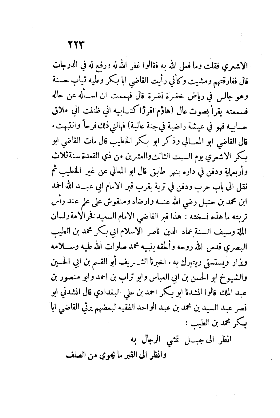 قَالَ الْقَاضِي أَبُو الْمَعَالِي وَذكر أَبُو بكر الْخَطِيب قَالَ مَاتَ الْقَاضِي أَبُو بكر الْأَشْعَرِيّ يَوْم السبت الثَّالِث وَالْعِشْرين من ذِي الْقعدَة سنة ثَلَاث وأربعماية وَدفن فِي دَاره بنهر طابق قَالَ أَبُو الْمَعَالِي عَن غير الْخَطِيب ثمَّ نقل إِلَى بَاب حَرْب وَدفن فِي تربة بِقرب قبر الإِمَام أَبِي عَبْد اللَّهِ أَحْمد ابْن حَنْبَلٍ رَضِيَ اللَّهُ عَنْهُ وأرضاه ومنقوش على علم عِنْد رَأس تربته مَا هَذِهِ نسخته هَذَا قبر الْقَاضِي الإِمَام السعيد فَخر الْأمة ولسان الْملَّة وَسيف السّنة عماد الدّين نَاصر الْإِسْلَام أَبِي بكر مُحَمَّد بن الطّيب الْبَصْرِيّ قدس اللَّه روحه وألحقه بِنَبِيِّهِ مُحَمَّد صلوَات اللَّه عَلَيْهِ وَسَلَامه ويزار ويستسقى ويتبرك بِهِ