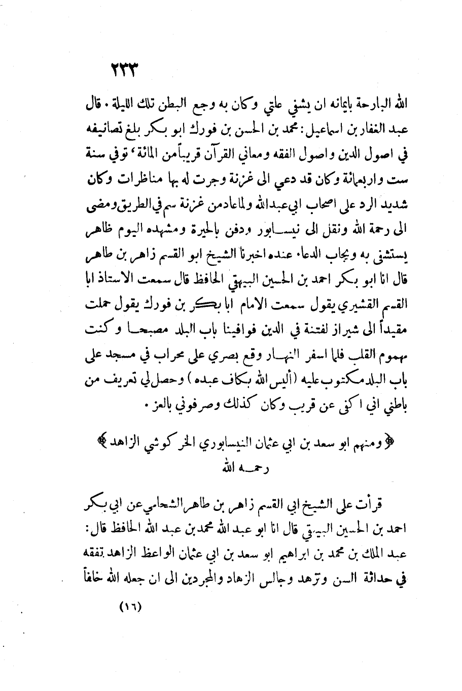 قَرَأت على الشَّيْخ أبي الْقسم زَاهِر بن طَاهِر الشحامي عَنْ أَبِي بكر أَحْمد بن الْحُسَيْنِ الْبَيْهَقِيّ قَالَ أَنا أَبُو عَبْدِ اللَّهِ مُحَمَّدُ بْنُ عَبْدِ اللَّهِ الْحَافِظ قَالَ عَبْد الْملك بن مُحَمَّدِ بْنِ إِبْرَاهِيمَ أَبُو سعد بن أَبِي عُثْمَانَ الْوَاعِظ الزَّاهِد تفقه فِي حَدَاثَة السن وتزهد وجالس الزهاد والمجردين إِلَى أَن جعله اللَّه خلفا