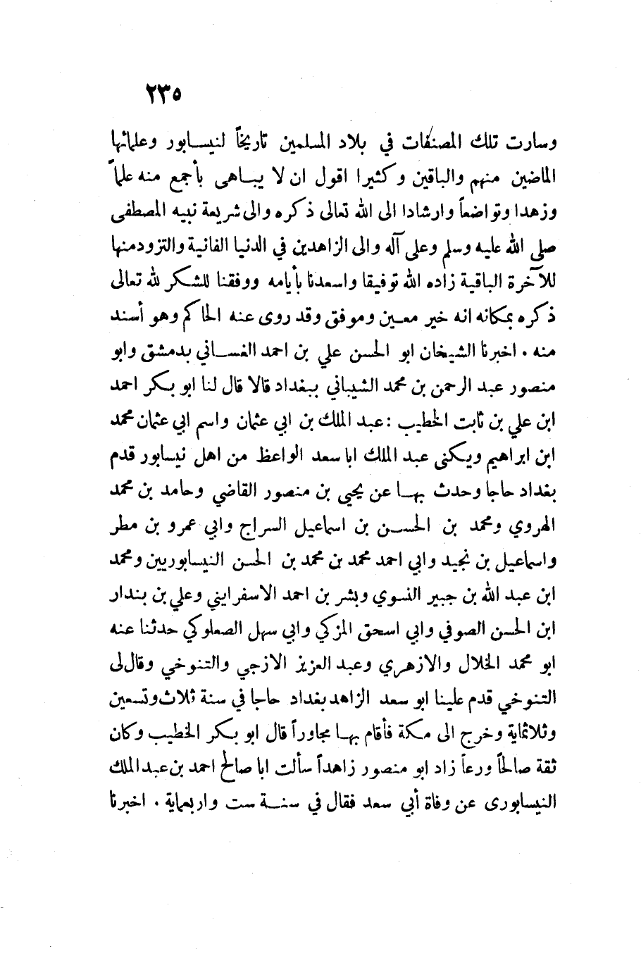 وسارت تِلْكَ المصنفات فِي بِلَاد الْمُسلمين تَارِيخا لنيسابور وعلمائها الماضين مِنْهُم والباقين وَكَثِيرًا أَقُول أَن لَا يباهى بأجمع مِنْهُ علما وزهدا وتواضعا وإرشادا إِلَى اللَّه تَعَالَى ذكره وَإِلَى شَرِيعَة نبيه الْمُصْطَفى صَلَّى اللَّهُ عَلَيْهِ وَسَلَّمَ وعَلى آله وَإِلَى الزاهدين فِي الدُّنْيَا الفانية والتزود مِنْهَا للآخرة الْبَاقِية زَاده اللَّه تَوْفِيقًا وأسعدنَا بأيامه ووفقنَا للشكر لِلَّه تَعَالَى ذكره بمكانه إِنَّه خير معِين وموفق وَقد روى عَنهُ الْحَاكِم وَهُوَ أسْند مِنْهُ