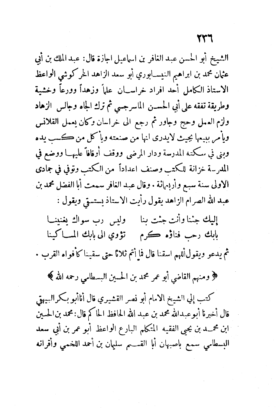 وَقَالَ عبد الغافر سَمِعت أَبَا الْفضل مُحَمَّد بن عَبْدِ اللَّهِ الصرام الزَّاهِد يَقُول رَأَيْت الْأُسْتَاذ يَسْتَسْقِي وَيَقُول ... إِلَيْك جئنَا وَأَنت جِئْت بِنَا