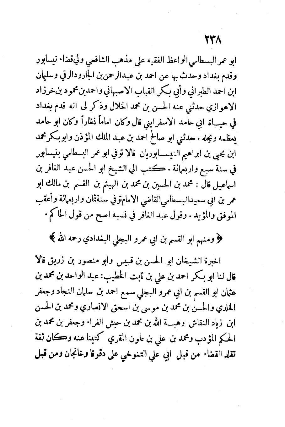 كتب إِلَيّ الشَّيْخ أَبُو الْحَسَنِ عبد الغافر بن إِسْمَاعِيلَ قَالَ مُحَمَّدُ بْنُ الْحُسَيْنِ بْنِ مُحَمَّدِ بن الْهَيْثَم بن الْقسم بن مَالك أَبُو عمر بن أَبِي سعيد البسطامي الْقَاضِي الإِمَام توفّي سنة ثَمَان وَأَرْبَعمِائَة وأعقب الْمُوفق والمؤيد