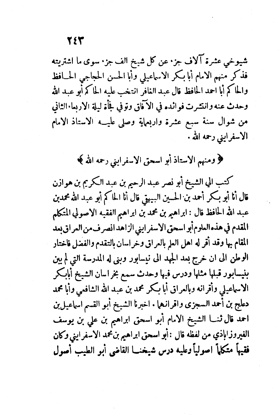 كتب إليَّ الشَّيْخ أَبُو نصر عبد الرَّحِيم بن عَبْدِ الْكَرِيم بن هوَازن قَالَ أَنا أَبُو بَكْرٍ أَحْمَدُ بْنُ الْحُسَيْنِ الْبَيْهَقِيّ قَالَ انا الْحَاكِم أَبُو عَبْدِ اللَّهِ مُحَمَّدُ بْنُ عَبْدِ اللَّهِ الْحَافِظُ قَالَ إِبْرَاهِيم بن مُحَمَّدِ بْنِ إِبْرَاهِيمَ الْفَقِيه الأصولي الْمُتَكَلّم الْمُقدم فِي هَذِه الْعُلُوم أَبُو اسحق الإسفرايني الزَّاهِد انْصَرف من الْعرَاق بعد الْمقَام بهَا وَقد أقرّ لَهُ أهل الْعلم بالعراق وخراسان بالتقدم وَالْفضل فَاخْتَارَ الوطن إِلَى أَن خرج بعد الْجهد إِلَى نيسابور وَبنى لَهُ الْمدرسَة الَّتِي لم يبن بنيسابور قبلهَا مثلهَا ودرس فِيهَا وَحدث سمع بخراسان الشَّيْخ أَبَا بكر الْإِسْمَاعِيلِيّ وأقرانه وبالعراق أَبَا بكر مُحَمَّد بن عَبْدِ اللَّهِ الشَّافِعِي وَأَبا مُحَمَّد دعْلج بن أَحْمَدَ السجْزِي وأقرانهما
