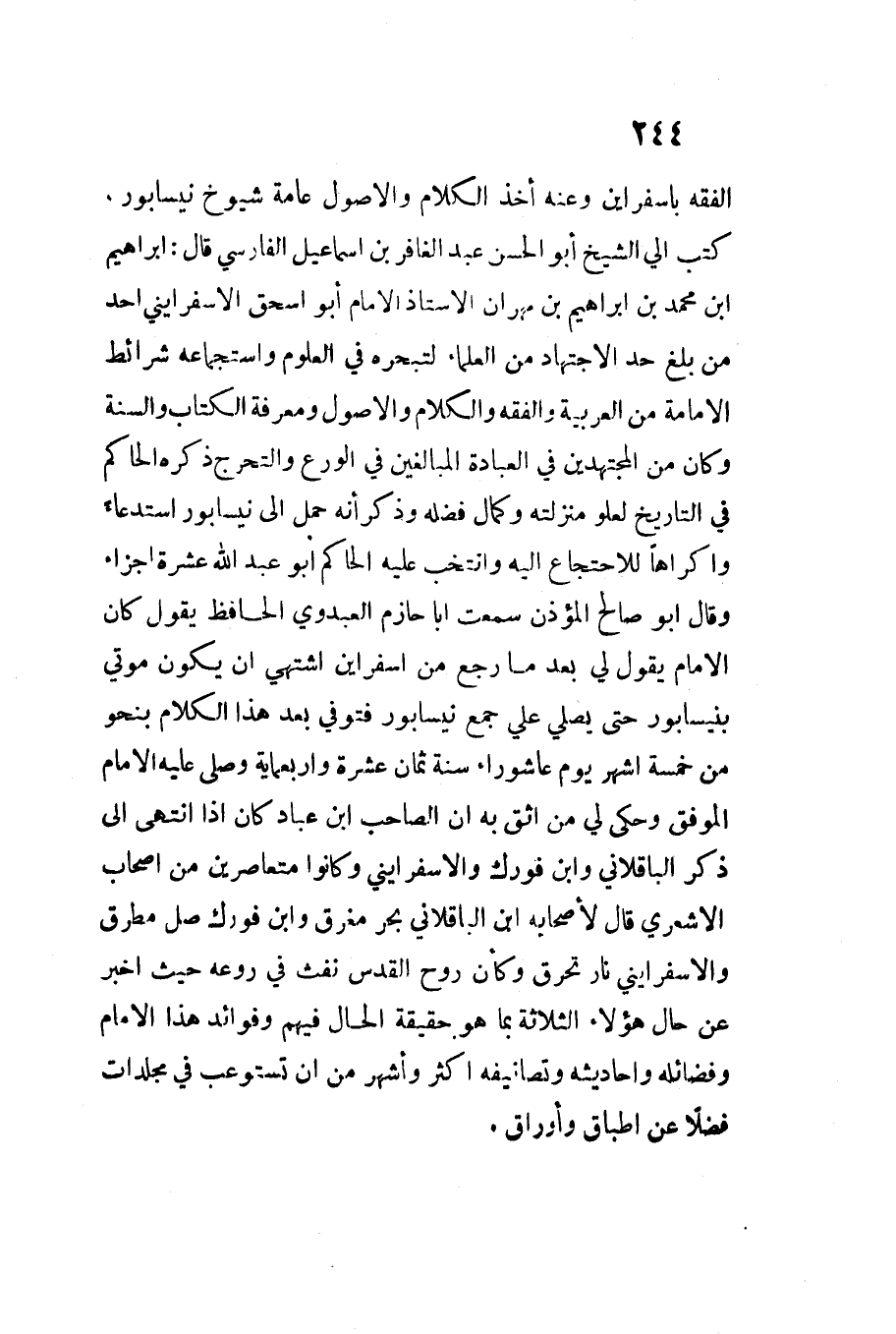 كتب إليَّ الشَّيْخ أَبُو الْحَسَنِ عبد الغافر بن إِسْمَاعِيلَ الْفَارِسِي قَالَ إِبْرَاهِيم ابْن مُحَمَّدِ بْنِ إِبْرَاهِيمَ بن مهْرَان الْأُسْتَاذ الإِمَام أَبُو اسحق الإسفرايني أحد من بلغ حد الِاجْتِهَاد من الْعلمَاء لتبحره فِي الْعُلُوم واستجماعه شَرَائِط الْإِمَامَة من الْعَرَبيَّة وَالْفِقْه وَالْكَلَام وَالْأُصُول وَمَعْرِفَة الْكتاب وَالسّنة وَكَانَ من الْمُجْتَهدين فِي الْعِبَادَة المبالغين فِي الْوَرع والتحرج ذكره الْحَاكِم فِي التَّارِيخ لعلو مَنْزِلَته وَكَمَال فَضله وَذكر أَنه حمل إِلَى نيسابور استدعاءً وإكراها للإحتجاج إِلَيْهِ وانتخب عَلَيْهِ الْحَاكِم أَبُو عَبْدِ اللَّهِ عشرَة أَجزَاء وَقَالَ أَبُو صَالح الْمُؤَذّن سَمِعت أَبَا حَازِم العبدوي الْحَافِظ يَقُول كَانَ الإِمَام يَقُول لي بعد مَا رَجَعَ من إسفراين أشتهي أَن يكون موتى بِنَيْسَابُورَ حَتَّى يُصَلِّي عَليّ جمع نيسابور فَتوفي بعد هَذَا الْكَلَام بِنَحْوِ من خَمْسَة أشهر يَوْم عَاشُورَاء سنة ثَمَان عشرَة وأربعماية وَصلى عَلَيْهِ الإِمَام الْمُوفق وَحكى لي من أَثِق بِهِ أَن الصاحب ابْن عباد كَانَ إِذَا انْتهى إِلَى ذكر الباقلاني وابْن فورك والإسفرايني وَكَانُوا متعاصرين من أَصْحَاب الْأَشْعَرِيّ قَالَ لأَصْحَابه ابْن الباقلاني بَحر مغرق وابْن فورك صل مطرق والإسفرايني نَار تحرق وَكَأن روح الْقُدس نفث فِي روعه حَيْثُ أخبر عَن حَال هَؤُلَاءِ الثَّلَاثَة بِمَا هُوَ حَقِيقَة الْحَال فيهم وفوائد هَذَا الإِمَام وفضائله وَأَحَادِيثه وتصانيفه أَكثر وَأشهر من أَن تستوعب فِي مجلدات فضلا عَن أطباق وأوراق