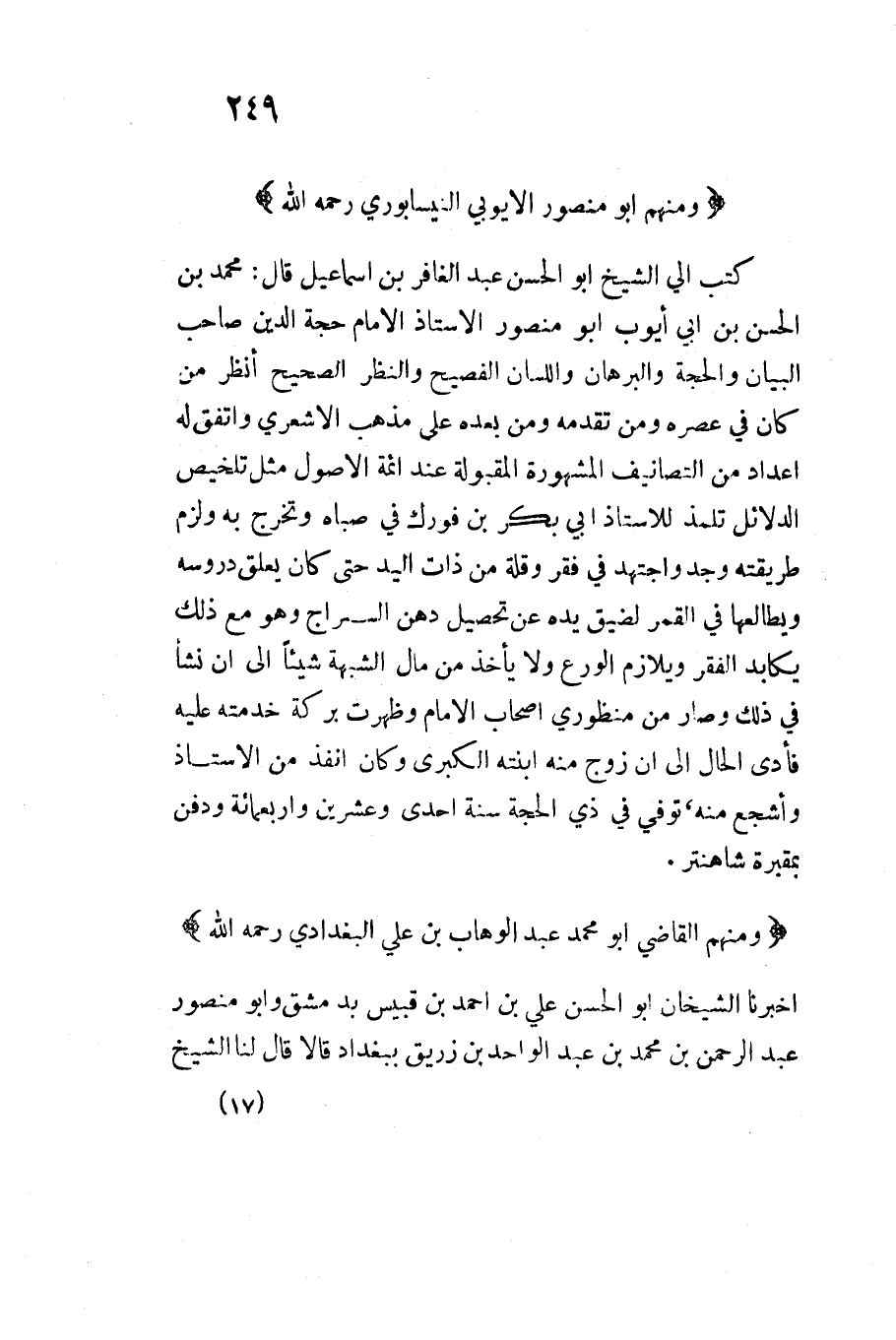 كتب إليَّ الشَّيْخ أَبُو الْحَسَنِ عبد الغافر بن إِسْمَاعِيلَ قَالَ مُحَمَّد بن الْحَسَنِ بن أَبِي أَيُّوب أَبُو مَنْصُور الْأُسْتَاذ الإِمَام حجَّة الدّين صَاحب الْبَيَان وَالْحجّة والبرهان وَاللِّسَان الفصيح وَالنَّظَر الصَّحِيح أنظر الصَّحِيح أنظر من كَانَ فِي عصره وَمن تقدمه وَمن بعده على مَذْهَب الْأَشْعَرِيّ وَاتفقَ لَهُ أعداد من التصانيف الْمَشْهُورَة المقبولة عِنْد أَئِمَّة الْأُصُول مثل تَلْخِيص الدَّلَائِل تلمذ للأستاذ أَبِي بكر بن فورك فِي صباه وَتخرج بِهِ وَلزِمَ طَرِيقَته وجد واجتهد فِي فقر وَقلة من ذَات الْيَد حَتَّى كَانَ يعلق دروسه ويطالعها فِي الْقَمَر لضيق يَده عَن تَحْصِيل دهن السراج وَهُوَ مَعَ ذَلِك يكابد الْفقر ويلازم الْوَرع وَلَا يَأْخُذ من مَال الشُّبْهَة شَيْئا إِلَى أَن نَشأ فِي ذَلِك وَصَارَ من منظوري أَصْحَاب الإِمَام وَظَهَرت بركَة خدمته عَلَيْهِ فَأدى الْحَال إِلَى أَن زوج مِنْهُ ابْنَته الْكُبْرَى وَكَانَ أنفذ من الْأُسْتَاذ وَأَشْجَع مِنْهُ توفّي فِي ذِي الْحجَّة سنة إِحْدَى وَعشْرين وَأَرْبَعمِائَة وَدفن بمقبرة شاهنتر