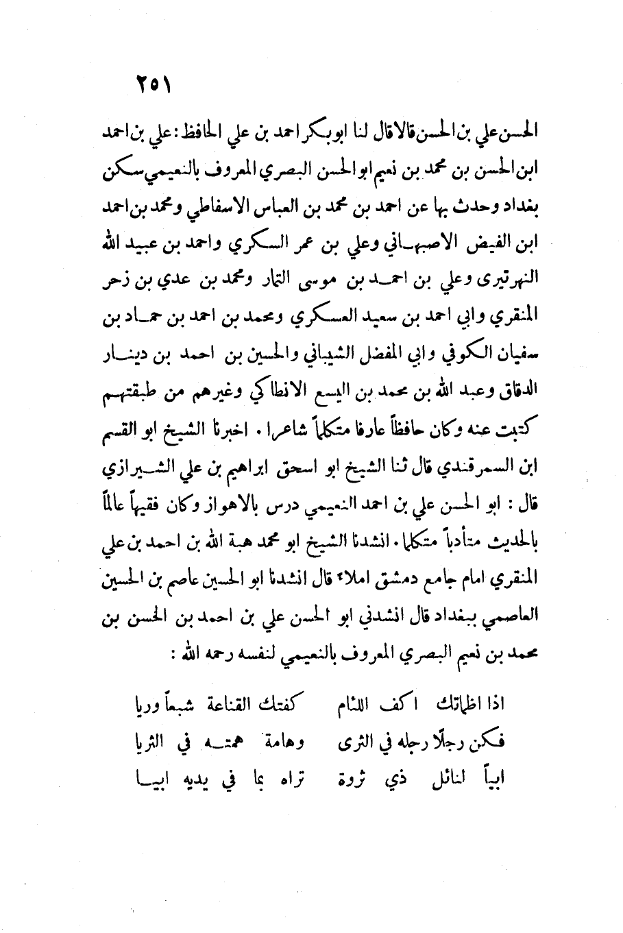 أنشدنَا الشَّيْخُ أَبُو مُحَمَّدٍ هِبَةُ اللَّهِ بن أَحْمَدَ بْنِ عَليّ الْمنْقري إِمَام جَامع دمشق إملاءً قَالَ أنشدنا أَبُو الْحُسَيْن عَاصِم بن الْحُسَيْنِ العاصمي بِبَغْدَادَ قَالَ أَنْشدني أَبُو الْحَسَنِ عَلِيُّ بْنُ أَحْمَدَ بْنِ الْحَسَنِ بْنِ مُحَمَّدِ بْنِ نعيم الْبَصْرِيّ الْمَعْرُوف بالنعيمي لنَفسِهِ رَحمَه اللَّه ... إِذا أظمأتك أكف اللئام