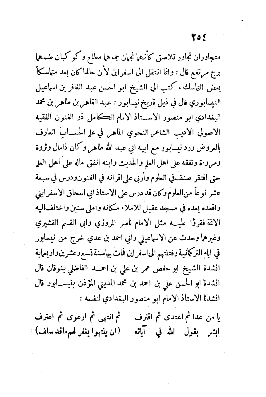 كتب إليَّ الشَّيْخ أَبُو الْحَسَنِ عبد الغافر بن إِسْمَاعِيلَ النَّيْسَابُورِي قَالَ فِي ذيل تَارِيخ نيسابور عبد القاهر بن طَاهِر بن مُحَمَّد الْبَغْدَادِيّ أَبُو مَنْصُور الْأُسْتَاذ الإِمَام الْكَامِل ذُو الْفُنُون الْفَقِيه الأصولي الأديب الشَّاعِر النَّحْوِيّ الماهر فِي علم الْحساب الْعَارِف بالعروض ورد نيسابور مَعَ أَبِيه أَبِي عَبْد اللَّهِ طَاهِر وَكَانَ ذَا مَال وثروة ومروءة وتفقه على أهل الْعلم والْحَدِيث وابْنه أنْفق مَاله على أهل الْعلم حَتَّى افْتقر صنف فِي الْعُلُوم وأربى على أقرانه فِي الْفُنُون ودرس فِي سَبْعَة عشر نوعا من الْعُلُوم وَكَانَ قد درس على الْأُسْتَاذ أَبِي إِسْحَاق الإسفرايني وَأَقْعَدَهُ بعده فِي مَسْجِد عقيل للإملاء مَكَانَهُ وأملى سِنِين وَاخْتلف إِلَيْهِ الْأَئِمَّة فقرؤا عَلَيْهِ مثل الإِمَام نَاصِر المرزوي وَأبي الْقسم الْقشيرِي وَغَيرهمَا وَحدث عَن الْإِسْمَاعِيلِيّ وَأبي أَحْمد بن عدي خرج من نيسابور فِي أَيَّام التركمانية وفتنتهم إِلَى إسفراين فَمَاتَ بهَا سنة تسع وَعشْرين وأربعماية أنشدنَا الشَّيْخ أَبُو حَفْصٍ عُمَرُ بْنُ عَلِيِّ بْنِ أَحْمَدَ الفاضلي بنوقان قَالَ أنشدنَا أَبُو الْحَسَنِ عَلِيُّ بْنُ أَحْمَدَ بْنِ مُحَمَّد الْمَدِينِيّ الْمُؤَذّن بِنَيْسَابُورَ قَالَ أنشدنَا الْأُسْتَاذ الإِمَام أَبُو مَنْصُور الْبَغْدَادِيّ لنَفسِهِ ... يَا من عدا ثمَّ اعْتدى ثمَّ اقْتَرَف