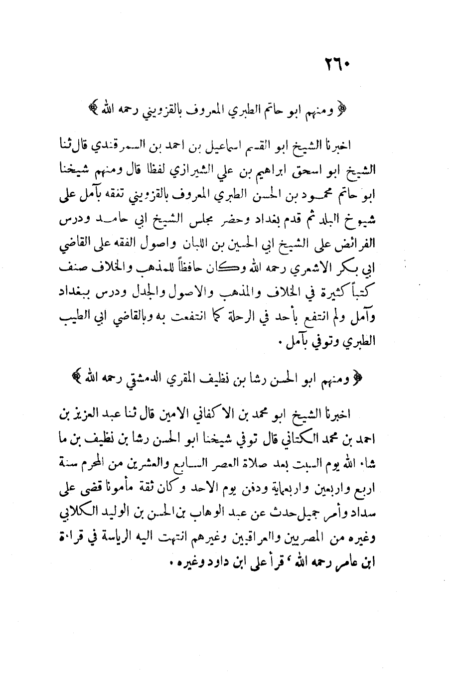 أَخْبَرَنَا الشَّيْخُ أَبُو الْقسم إِسْمَاعِيلُ بْنُ أَحْمَدَ بْنِ السَّمَرْقَنْدِيِّ قَالَ ثَنَا الشَّيْخ أَبُو اسحق إِبْرَاهِيم بن عَليّ الشِّيرَازِيّ لفظا قَالَ وَمِنْهُم شيخنَا أَبُو حَاتِم مَحْمُود بن الْحَسَنِ الطَّبَرِيّ الْمَعْرُوف بالقزويني تفقه بآمل على شُيُوخ الْبَلَد ثمَّ قدم بَغْدَاد وَحضر مجْلِس الشَّيْخ أَبِي حَامِد ودرس الْفَرَائِض على الشَّيْخ أَبِي الْحُسَيْن بن اللبان وأصول الْفِقْه على الْقَاضِي أَبِي بكر الْأَشْعَرِيّ رَحمَه اللَّه وَكَانَ حَافِظًا للْمَذْهَب وَالْخلاف صنف كتبا كَثِيرَة فِي الْخلاف وَالْمذهب وَالْأُصُول والجدل ودرس بِبَغْدَادَ وآمل وَلم أنتفع بِأحد فِي الرحلة كَمَا انتفعت بِهِ وبالْقَاضِي أَبِي الطّيب الطَّبَرِيّ وَتُوفِّي بآمل