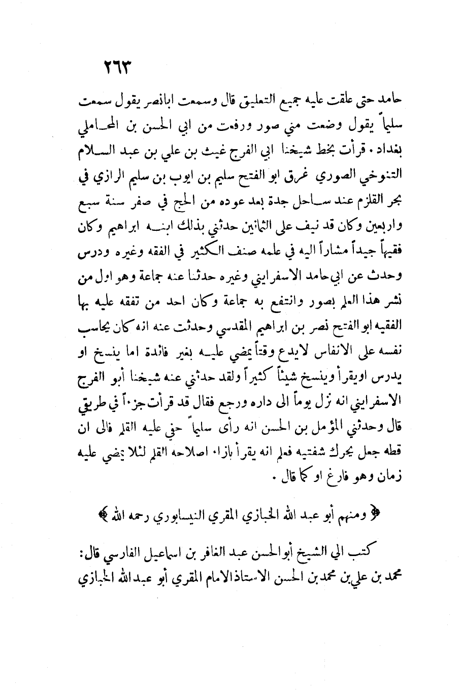 حَامِد حَتَّى علقت عَلَيْهِ جَمِيع التَّعْلِيق قَالَ وَسمعت أَبَا نصر يَقُول سَمِعت سليما يَقُول وضعت مني صور وَرفعت من أَبِي الْحسن بن الْمحَامِلِي بَغْدَاد