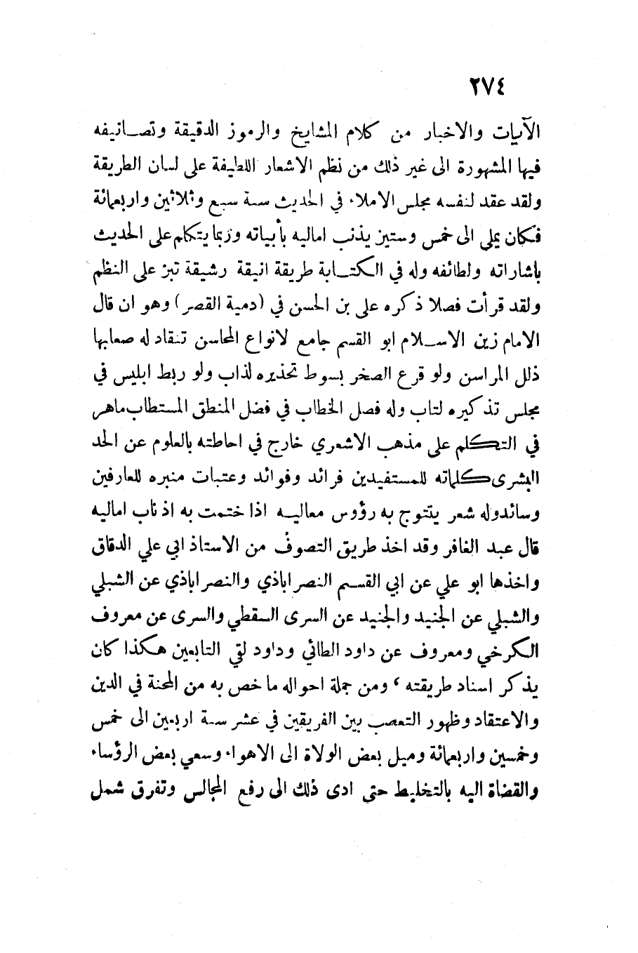 الْآيَات وَالْأَخْبَار من كَلَام الْمَشَايِخ والرموز الدقيقة وتصانيفه فِيهَا الْمَشْهُورَة إِلَى غير ذَلِك من نظم الْأَشْعَار اللطيفة على لِسَان الطَّرِيقَة وَلَقَد عقد لنَفسِهِ مجْلِس الْإِمْلَاء فِي الحَدِيث سنة سبع وَثَلَاثِينَ وَأَرْبَعمِائَة فَكَانَ يملي إِلَى خمس وَسِتِّينَ يذّنب أَمَالِيهِ بأبياته وَرُبمَا يتَكَلَّم على الحَدِيث بإشاراته ولطائفه وَله فِي الْكِتَابَة طَريقَة أنيقة رشيقة تبز على النّظم وَلَقَد قَرَأت فصلا ذكره عَليّ بن الْحَسَنِ فِي دمية الْقصر وَهُوَ أَن قَالَ الإِمَام زين الْإِسْلَام أَبُو الْقسم جَامع لأنواع المحاسن تنقاد لَهُ صعابها ذلل المراسن وَلَو قرع الصخر بِسَوْط تحذيره لذاب وَلَو ربط إِبْلِيس فِي مجْلِس تذكيره لتاب وَله فصل الْخطاب فِي فضل الْمنطق المستطاب ماهر فِي التَّكَلُّم على مَذْهَب الْأَشْعَرِيّ خَارج فِي إحاطته بالعلوم عَن الْحَد البشري كَلِمَاته للمستفيدين فرائد وفوائد وعتبات منبره للعارفين وسائد وَله شعر يتتوج بِهِ رُؤُوس معاليه إِذَا ختمت بِهِ أذنَاب أَمَالِيهِ قَالَ عبد الغافر وَقد أَخذ طَرِيق التصوف من الْأُسْتَاذ أَبِي عَليّ الدقاق وَأَخذهَا أَبُو على عَن أبي الْقسم النَّصْر أباذي والنصر أباذي عَن الشبلي والشبلي عَن الْجُنَيْد والجنيد عَن السّري السَّقطِي وَالسري عَن مَعْرُوف الْكَرْخِي ومعروف عَن دَاوُد الطَّائِي وَدَاوُد لَقِي التَّابِعين هَكَذَا كَانَ يذكر إسنَاد طَرِيقَته وَمن جملَة أَحْوَاله مَا خص بِهِ من المحنة فِي الدّين والاعتقاد وَظُهُور التعصب بَين الْفَرِيقَيْنِ فِي عشر سنة أَرْبَعِينَ إِلَى خمس وَخمسين وَأَرْبَعمِائَة وميل بعض الْوُلَاة إِلَى الْأَهْوَاء وسعي بعض الرؤساء والقضاة إِلَيْهِ بالتخليط حَتَّى أدّى ذَلِك إِلَى رفع الْمجَالِس وتفرق شَمل