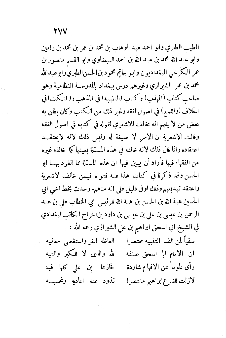 الطّيب الطَّبَرِيّ وأَبُو أَحْمد عبد الْوَهَّاب بن مُحَمَّدِ بْنِ عمر بن مُحَمَّدِ بْنِ رامين وأَبُو عَبْدِ اللَّهِ مُحَمَّدُ بْنُ عَبْدِ اللَّهِ بْنِ أَحْمَدَ الْبَيْضَاوِيّ وأَبُو الْقسم مَنْصُور بن عُمَرَ الْكَرْخِي البغداديون وَأَبُو حَاتِم مَحْمُود بن الْحَسَنِ الطَّبَرِيّ وأَبُو عَبْدِ اللَّهِ مُحَمَّدُ بْنُ عمر الشِّيرَازِيّ وَغَيرهم درس بِبَغْدَادَ بِالْمَدْرَسَةِ النظامية وَهُوَ صَاحب كتاب الْمُهَذّب وَكتاب التَّنْبِيه فِي الْمَذْهَب والنكت فِي الْخلاف واللمع فِي أصُول الْفِقْه وَغير ذَلِك من الْكتب وَكَانَ يَظُن بِهِ بعض من لَا يفهم أَنه مُخَالف للأشعري لقَوْله فِي كِتَابه فِي أصُول الْفِقْه وَقَالَت الأشعرية أَن الْأَمر لَا صِيغَة لَهُ وَلَيْسَ ذَلِك لِأَنَّهُ لَا يعْتَقد اعْتِقَاده وَإِنَّمَا قَالَ ذَلِك لِأَنَّهُ خَالفه فِي هَذِه المسئلة بِعَينهَا كَمَا خَالفه غَيره من الْفُقَهَاء فِيهَا فَأَرَادَ أَن يبين فِيهَا ان هَذِه المسئلة مِمَّا انْفَرد بهَا أَبُو الْحَسَنِ وَقد ذكرنَا فِي كتابنَا هَذَا عَنهُ فتواه فِيمَن خَالف الأشعرية واعتقد تبديعهم وَذَلِكَ أوفى دَلِيل على أَنه مِنْهُم