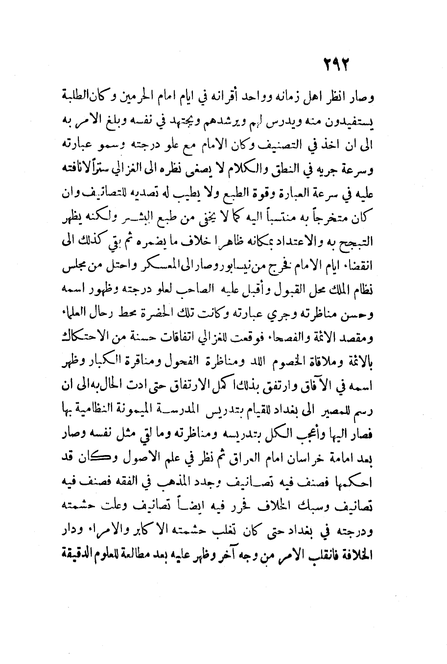 وَصَارَ أنظر أهل زَمَانه وَوَاحِد أقرانه فِي أَيَّام إِمَام الْحَرَمَيْنِ وَكَانَ الطّلبَة يستفدزن مِنْهُ ويدرس لَهُم ويرشدهم ويجتهد فِي نَفسه وَبلغ الْأَمر بِهِ إِلَى أَن أَخذ فِي التصنيف وَكَانَ الإِمَام مَعَ علو دَرَجَته وسمو عِبَارَته وَسُرْعَة جريه فِي النُّطْق وَالْكَلَام لَا يصغي نظره الى الغزالى سترا لأناقته عَلَيْهِ فِي سرعَة الْعبارَة وَقُوَّة الطَّبْع وَلَا يطيب لَهُ تصديه للتصانيف وَإِن كَانَ متخرجا بِهِ منتسبا إِلَيْهِ كَمَا لَا يخفى من طبع الْبشر وَلكنه يظْهر التبجح بِهِ والاعتداد بمكانه ظَاهرا خلاف مَا يضمره ثمَّ بَقِي كَذَلِك إِلَى انْقِضَاء أَيَّام الإِمَام فَخرج من نيسابور وَصَارَ إِلَى المعسكر واحتل من مجْلِس نظام الْملك مَحل الْقبُول وَأَقْبل عَلَيْهِ الصاحب لعلو دَرَجَته وَظُهُور اسْمه وَحسن منَاظرته وجري عِبَارَته وَكَانَت تِلْكَ الحضرة محط رحال الْعلمَاء ومقصد الْأَئِمَّة والفصحاء فَوَقَعت للغزالي اتفاقات حَسَنَة من الاحتكاك بالأئمة وملاقاة الْخُصُوم اللد ومنَاظرة الفحول ومنَاقرة الْكِبَار وَظهر اسْمه فِي الْآفَاق وارتفق بذلك أكمل الارتفاق حَتَّى أدَّت الْحَال بِهِ إِلَى أَن رسم للمصير إِلَى بَغْدَاد للْقِيَام بتدريس الْمدرسَة الميمونة النظامية بهَا فَصَارَ إِلَيْهَا وأعجب الْكل بتدريسه ومنَاظرته وَمَا لَقِي مثل نَفسه وَصَارَ بعد إِمَامَة خُرَاسَان إِمَام الْعرَاق ثمَّ نظر فِي علم الْأُصُول وَكَانَ قد أحكمها فصنف فِيهِ تصانيف وجدد الْمَذْهَب فِي الْفِقْه فصنف فِيهِ تصانيف وسبك الْخلاف فحرر فِيهِ أَيْضا تصانيف وعلت حشمته ودرجته فِي بَغْدَاد حَتَّى كَانَ تغلب حشمته الأكابر والأمراء وَدَار الْخلَافَة فَانْقَلَبَ الْأَمر من وَجه آخر وَظهر عَلَيْهِ بعد مطالعة للعلوم الدقيقة