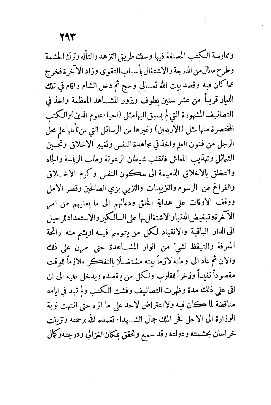وممارسة الْكتب المصنفة فِيهَا وسلك طَرِيق التزهد والتأله وَترك الحشمة وَطرح مَا نَال من الدرجَة والاشتغال بِأَسْبَاب التَّقْوَى وَزَاد الْآخِرَة فَخرج عَمَّا كَانَ فِيهِ وَقصد بَيت اللَّه تَعَالَى وَحج ثمَّ دخل الشَّام وَأقَام فِي تِلْكَ الديار قَرِيبا من عشر سِنِين يطوف ويزور الْمشَاهد المعظمة وَأخذ فِي التصانيف الْمَشْهُورَة الَّتِي لم يسْبق إِلَيْهَا مثل إحْيَاء عُلُوم الدّين والكتب المختصرة مِنْهَا مثل الْأَرْبَعين وَغَيرهَا من الرسائل الَّتِي من تأملها علم مَحل الرجل من فنون الْعلم وَأخذ فِي مجاهدة النَّفس وتغيير الْأَخْلَاق وتحسين الشَّمَائِل وتهذيب المعاش فَانْقَلَبَ شَيْطَان الرعونة وَطلب الرياسة والجاه والتخلق بالأخلاق الذميمة إِلَى سُكُون النَّفس وكرم الْأَخْلَاق والفراغ عَن الرسوم والتزيينَات والتزيي بزِي الصَّالِحين وَقصر الأمل ووقف الْأَوْقَات على هِدَايَة الْخلق ودعائهم إِلَى مَا يعنيهم من أَمر الْآخِرَة وتبغيض الدُّنْيَا والاشتغال بهَا على السالكين والاستعداد للرحيل إِلَى الدَّار الْبَاقِية والانقياد لكل من يتوسم فِيهِ أَو يشم مِنْهُ رَائِحَة الْمعرفَة والتيقظ لشَيْء من أنوار الْمُشَاهدَة حَتَّى مرن على ذَلِك وألان ثمَّ عَاد إِلَى وَطنه لَازِما بَيته مشتغلا بالتفكر ملازما للْوَقْت مَقْصُودا نفيسًا وذخرا للقلوب وَلكُل من يَقْصِدهُ وَيدخل عَلَيْهِ إِلَى أَن أَتَى على ذَلِك مُدَّة وَظَهَرت التصانيف وفشت الْكتب وَلم تبد فِي أَيَّامه منَاقضة لما كَانَ فِيهِ وَلَا اعْتِرَاض لأحد على مَا أَثَره حَتَّى انْتَهَت نوبَة الوزارة إِلَى الْأَجَل فَخر الْملك جمال الشُّهَدَاء تغمده اللَّه برحمته وتزينت خُرَاسَان بحشمته ودولته وَقد سمع وَتحقّق بمَكَان الْغَزالِيّ ودرجته وَكَمَال