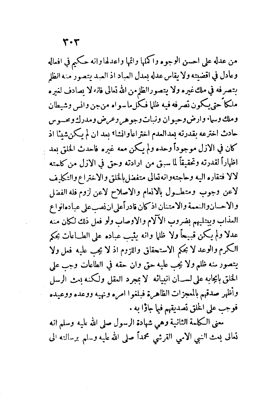 من عدله على أحسن الْوُجُوه وأكملها وأتمها وأعدلها وَأَنه حَكِيم فِي أَفعاله وعادل فِي أقضيته وَلَا يُقَاس عدله بِعدْل الْعباد إِذْ العَبْد يتَصَوَّر مِنْهُ الظُّلم بتصرفه فِي ملك غَيره وَلَا يتَصَوَّر الظُّلم من اللَّه تَعَالَى فَإِنَّهُ لَا يُصَادف لغيره ملكا حَتَّى يكون تصرفه فِيهِ ظلما فَكل مَا سواهُ من جن وإنس وَشَيْطَان وَملك وسماء وَأَرْض وحيوان ونبات وجوهر وَعرض ومدرك ومحسوس حَادث اخترعه بقدرته بعد الْعَدَم اختراعا وإنشاءً بعد أَن لم يكن شَيْئا إِذْ كَانَ فِي الْأَزَل مَوْجُودا وَحده وَلم يكن مَعَه غَيره فأحدث الْخلق بعدُ إِظْهَارًا لقدرته وتحقيقا لما سبق من إِرَادَته وَحقّ فِي الْأَزَل من كَلمته لَا لافتقاره إِلَيْهِ وَحَاجته وَأَنه تَعَالَى متفضل بالخلق والاختراع والتكليف لَا عَن وجوب ومتطول بالإنعام والإصلاح لَا عَن لُزُوم فَلهُ الْفضل وَالْإِحْسَان وَالنعْمَة والامتنَان إِذْ كَانَ قَادِرًا على أَن نصب على عبَادَة أَنْوَاع الْعَذَاب ويبتليهم بضروب الآلام والأوصاب وَلَو فعل ذَلِك لَكَانَ مِنْهُ عدلا وَلم يكن قبيحا وَلَا ظلما وَأَنه يثيب عباده على الطَّاعَات بِحكم الْكَرم والوعد لَا بِحكم الِاسْتِحْقَاق واللزوم إِذْ لَا يجب عَلَيْهِ فعل وَلَا يتَصَوَّر مِنْهُ ظلم وَلَا يجب عَلَيْهِ حق وَأَن حَقه فِي الطَّاعَات وَجب على الْخلق بإيجابه على لِسَان أنبيائه لَا بِمُجَرَّد الْعقل وَلكنه بعث الرُّسُل وَأظْهر صدقهم بالمعجزات الظَّاهِرَة فبلغوا أمره وَنَهْيه ووعده ووعيده فَوَجَبَ على الْخلق تصديقهم فِيمَا جاؤا بِهِ