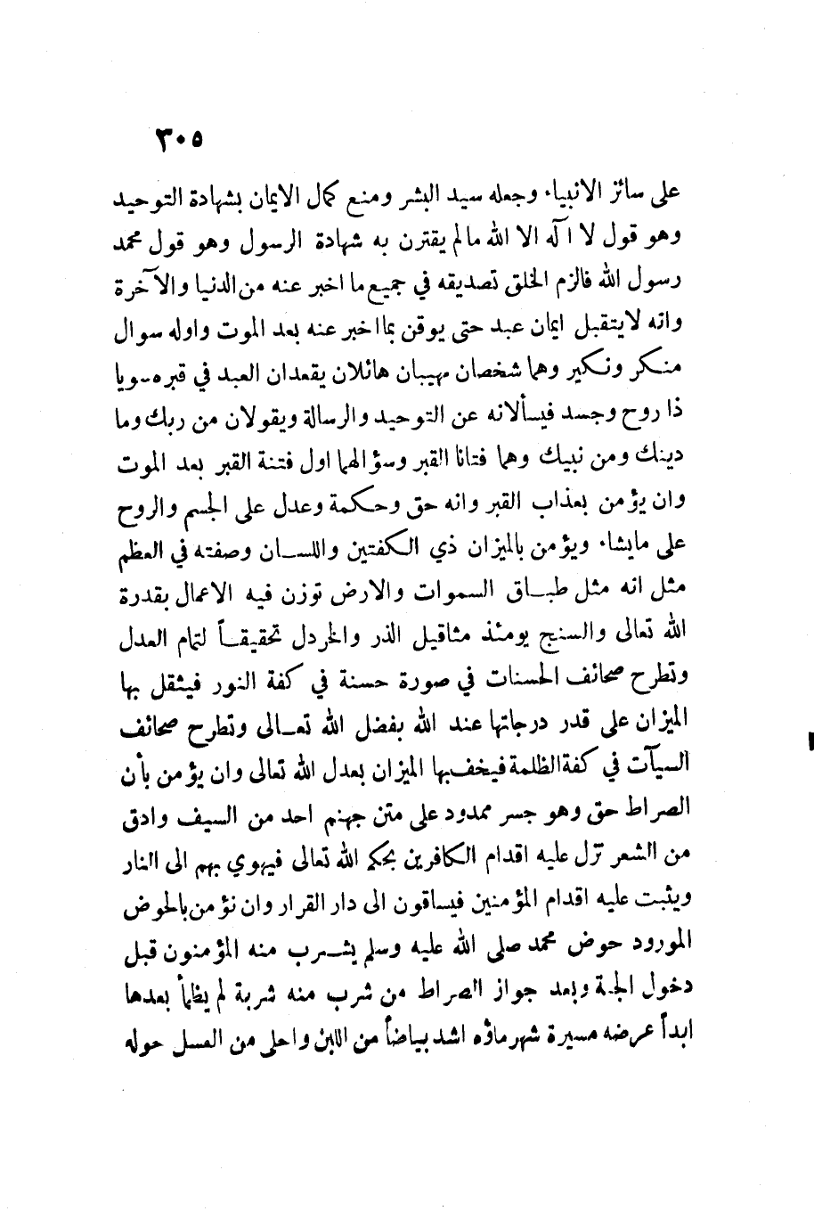 على سَائِر الْأَنْبِيَاء وَجعله سيد الْبشر وَمنع كَمَال الْإِيمَان بِشَهَادَة التَّوْحِيد وَهُوَ قَول لَا إِلَه إِلَّا اللَّه مَا لم يقْتَرن بِهِ شَهَادَة الرَّسُول وَهُوَ قَول مُحَمَّد رَسُول اللَّه فألزم الْخلق تَصْدِيقه فِي جَمِيع مَا أخبر عَنهُ من الدُّنْيَا وَالْآخِرَة وَأَنه لَا يتَقَبَّل إِيمَان عبد حَتَّى يُوقن بِمَا أخبر عَنهُ بعد الْمَوْت وأوله سُؤال مُنكر وَنَكِير وهما شخصان مهيبان هائلان يقعدان العَبْد فِي قَبره سويا ذَا روح وجسد فيسألانه عَن التَّوْحِيد والرسالة ويقولان من رَبك وَمَا دينك وَمن نبيك وهما فتانَا الْقَبْر وسؤالهما أول فتْنَة الْقَبْر بعد الْمَوْت وَأَن يُؤمن بِعَذَاب الْقَبْر وَأَنه حق وَحِكْمَة وَعدل على الْجِسْم وَالروح على مَا يَشَاء ويؤمن بالميزان ذِي الكفتين وَاللِّسَان وَصفته فِي الْعظم مثل أَنه مثل طباق السَّمَوَات وَالْأَرْض توزن فِيهِ الْأَعْمَال بقدرة اللَّه تَعَالَى والسنج يَوْمئِذٍ مَثَاقِيل الذَّر والخردل تَحْقِيقا لتَمام الْعدْل وتطرح صَحَائِف الحسنَات فِي صُورَة حَسَنَة فِي كفة النُّور فيثقل بهَا الْمِيزَان على قدر درجاتها عِنْد اللَّه بِفضل اللَّه تَعَالَى وتطرح صَحَائِف السيآت فِي كفة الظلمَة فيخف بهَا الْمِيزَان بِعدْل اللَّه تَعَالَى وَأَن يُؤمن بِأَن الصِّرَاط حق وَهُوَ جسر مَمْدُود على متن جَهَنَّم أحد من السَّيْف وأدق من الشّعْر تزل عَلَيْهِ أَقْدَام الْكَافرين بِحكم اللَّه تَعَالَى فَيهْوِي بههم إِلَى النَّار وَيثبت عَلَيْهِ أَقْدَام الْمُؤمنِينَ فيساقون إِلَى دَار الْقَرار وَأَن نؤمن بالحوض المرود حَوْض مُحَمَّد صَلَّى اللَّهُ عَلَيْهِ وَسَلَّمَ يشرب مِنْهُ الْمُؤْمِنُونَ قبل دُخُول الْجنَّة وَبعد جَوَاز الصِّرَاط من شرب مِنْهُ شربة لم يظمأ بعْدهَا أبدا عرضه مسيرَة شهر مَاؤُهُ أَشد بَيَاضًا من اللَّبن وَأحلى من الْعَسَل حوله