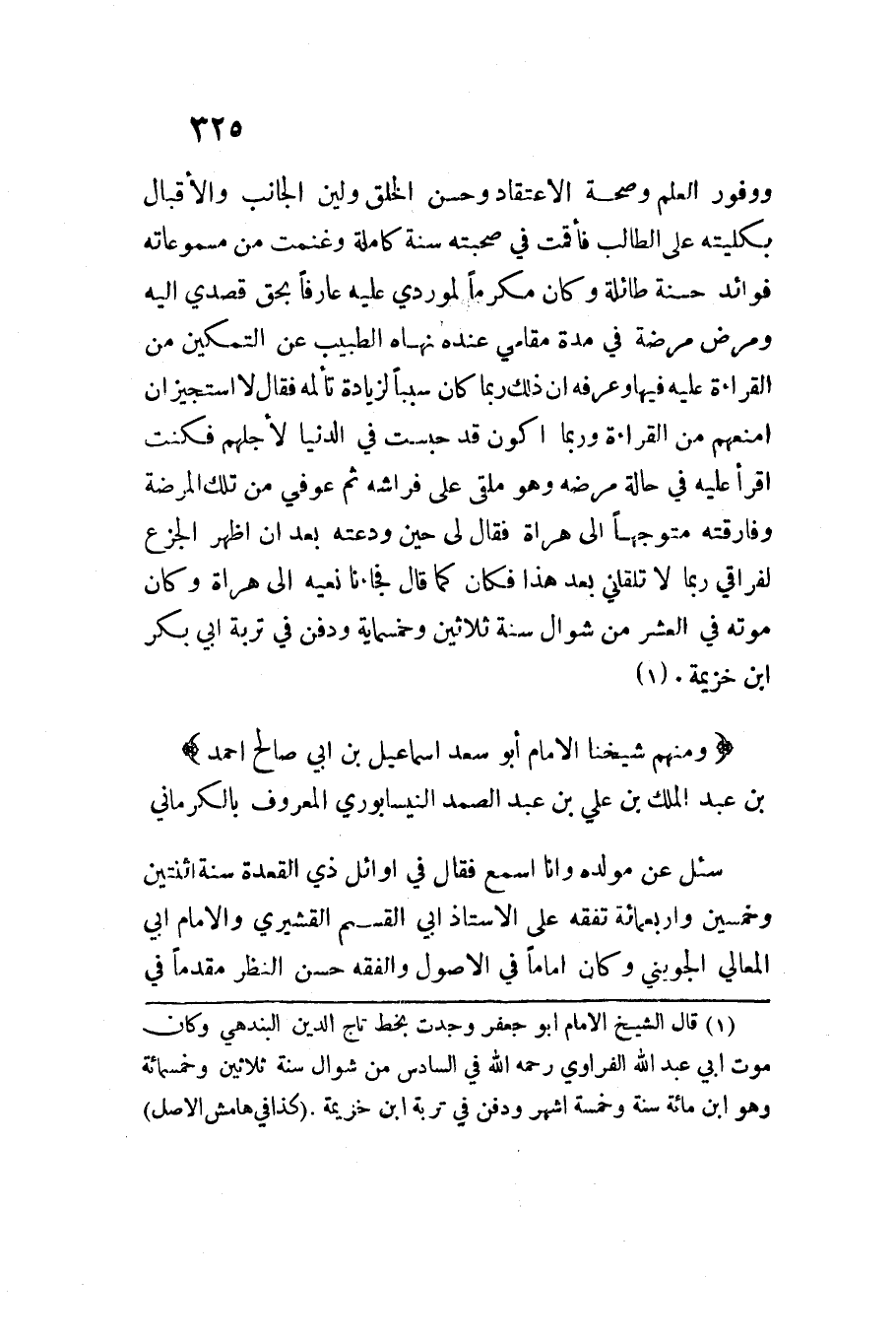 ووفور الْعلم وَصِحَّة الِاعْتِقَاد وَحسن الْخلق ولين الْجَانِب والإقبال بكليته على الطَّالِب فأقمت فِي صحبته سنة كَامِلَة وغنمت من مسموعاته فَوَائِد حَسَنَة طائلة وَكَانَ مكرما لموردي عَلَيْهِ عَارِفًا بِحَق قصدي إِلَيْهِ وَمرض مرضة فِي مُدَّة مقَامي عِنْده نَهَاهُ الطَّبِيب عَن التَّمْكِين من الْقِرَاءَة عَلَيْهِ فِيهَا وعرفه أَن ذَلِك رُبمَا كَانَ سَببا لزِيَادَة تألمه فَقَالَ لَا أستجيز أَن أمنعهم من الْقِرَاءَة وَرُبمَا أكون قد حبست فِي الدُّنْيَا لأجلهم فَكنت أَقرَأ عَلَيْهِ فِي حَالَة مَرضه وَهُوَ ملقي على فرَاشه ثمَّ عوفي من تِلْكَ المرضة وفارقته مُتَوَجها إِلَى هراة فَقَالَ لي حِين ودعته بعد أَن أظهر الْجزع لفراقي رُبمَا لَا تَلقانِي بعد هَذَا فَكَانَ كَمَا قَالَ فجاءنَا نعيه إِلَى هراة وَكَانَ مَوته فِي الْعشْر من شَوَّال سنة ثَلَاثِينَ وخمسماية وَدفن فِي تربة أَبِي بكر ابْن خُزَيْمَة