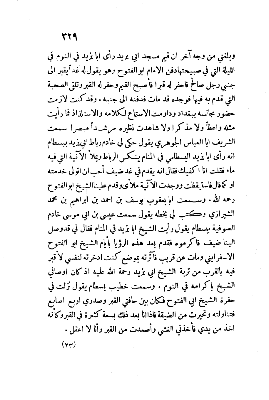 وَسمعت خطيب بسطَام يَقُول نزلت فِي حُفْرَة الشَّيْخ أَبِي الْفتُوح فَكَانَ بَين حافتي الْقَبْر وصدري أَربع أَصَابِع فتنَاولته وتحيرت من الضيقة فَإِذا أنَا بعد ذَلِك بسعة كَثِيرَة فِي الْقَبْر وَكَأَنَّهُ أَخذ من يَدي فأخذني الغشي وأصعدت من الْقَبْر وأنَا لَا أَعقل