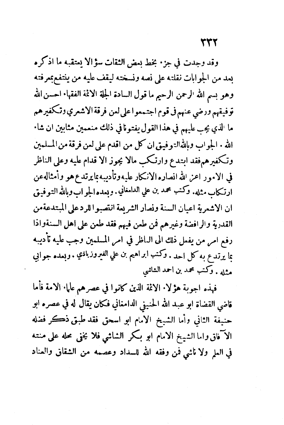 فهَذِهِ أجوبة هَؤُلَاءِ الْأَئِمَّة الَّذين كَانُوا فِي عصرهم عُلَمَاء الْأمة فَأَما قَاضِي الْقُضَاة أَبُو حنيفَة أَبُو عَبْدِ اللَّهِ الحنيفي الدَّامغَانِي فَكَانَ يُقال لَهُ فِي عصره أَبُو حنيفَة الثَّانِي وَأما الشَّيْخ الامام أَبُو اسحق فقد طبق ذكر فَضله الْآفَاق وَأما الشَّيْخ اللإمام أَبُو بكر الشَّاشِي فَلَا يخفى مَحَله على منته فِي الْعلم وَلَا نَاشي فَمن وَفقه اللَّه للسداد وَعَصَمَهُ من الشقاق والعنَاد