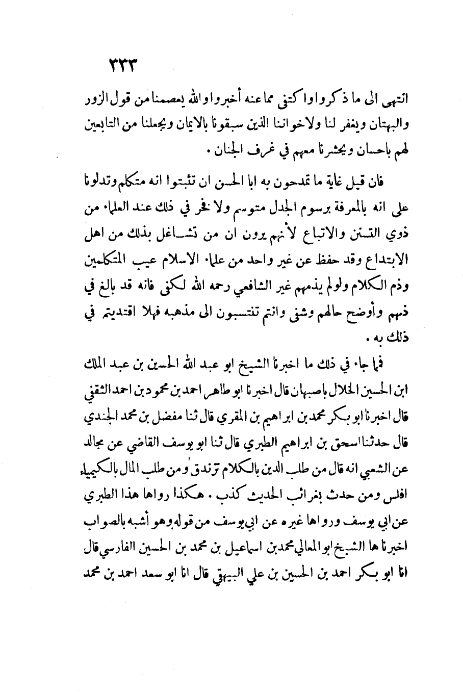فَإِن قيل غَايَة مَا تمدحون بِهِ أَبَا الْحسن أَن تثبتوا أَنه مُتَكَلم وتدلونَا على أَنه بالمعرفة برسوم الجدل متوسم وَلَا فَخر فِي ذَلِك عِنْد الْعلمَاء من ذَوي التسنن والاتباع لأَنهم يرَوْنَ أَن من تشاغل بذلك من أهل الابتداع وَقد حفظ عَن غير وَاحِد من عُلَمَاء الْإِسْلَام عيب الْمُتَكَلِّمين وذم الْكَلَام وَلَو لم يذمهم غير الشَّافِعِي رَحمَه اللَّه لكفى فَإِنَّهُ قد بَالغ فِي ذمهم وأوضح حَالهم وشفى وَأَنْتُم تنتسبون إِلَى مذْهبه فَهَلا اقْتَدَيْتُمْ فِي ذَلِك بِهِ