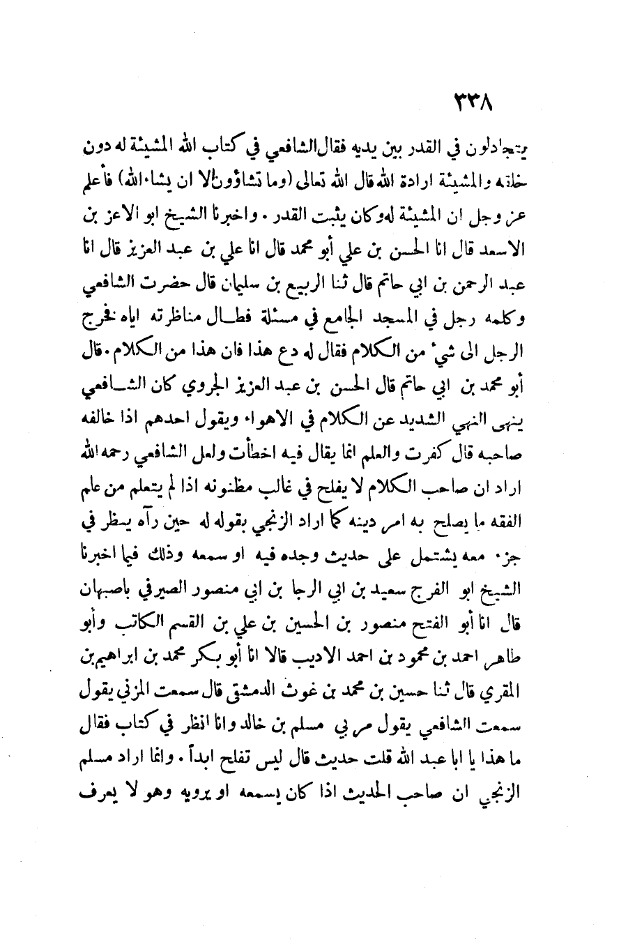 قَالَ أَبُو مُحَمَّد بن أَبِي حَاتِم قَالَ الْحسن بن عَبْدِ الْعَزِيزِ الجروي كَانَ الشَّافِعِي ينْهَى النَّهْي الشَّديد عَن الْكَلَام فِي الْأَهْوَاء وَيَقُول أحدهم إِذا خَالفه صَاحبه قَالَ كفرت وَالْعلم إِنَّمَا يُقَال فِيهِ أَخْطَأت وَلَعَلَّ الشَّافِعِي رَحمَه اللَّه أَرَادَ أَن صَاحب الْكَلَام لَا يفلح فِي غَالب مظنونه إِذَا لم يتَعَلَّم من علم الْفِقْه مَا يصلح بِهِ أَمر دينه كَمَا أَرَادَ الزنْجِي بقوله لَهُ حِين رَآهُ ينظر فِي جُزْء مَعَه يشْتَمل على حَدِيث وجده فِيهِ أَو سَمعه وَذَلِكَ فِيمَا أَخْبَرَنَا الشَّيْخُ أَبُو الْفرج سعيد بن أبي الرجا بن أَبِي مَنْصُور الصَّيْرَفِي بأصبهان قَالَ أَنا أَبُو الْفَتْحِ مَنْصُور بن الْحُسَيْنِ بن عَليّ بن الْقسم الْكَاتِب وأَبُو طَاهِرٍ أَحْمَدُ بْنُ مَحْمُود بن أَحْمَدَ الأديب قَالا أَنا أَبُو بَكْرٍ مُحَمَّدُ بْنُ إِبْرَاهِيمَ بن الْمقري قَالَ ثَنَا حُسَيْن بن مُحَمَّدِ بْنِ غوث الدِّمَشْقِي قَالَ سَمِعت الْمُزنِيّ يَقُول سَمِعت الشَّافِعِي يَقُول مر بِي مُسلم بن خَالِد وأنَا أنظر فِي كتاب فَقَالَ مَا هَذَا يَا أَبَا عَبْد اللَّهِ قلت حَدِيث قَالَ لَيْسَ تفلح أبدا
