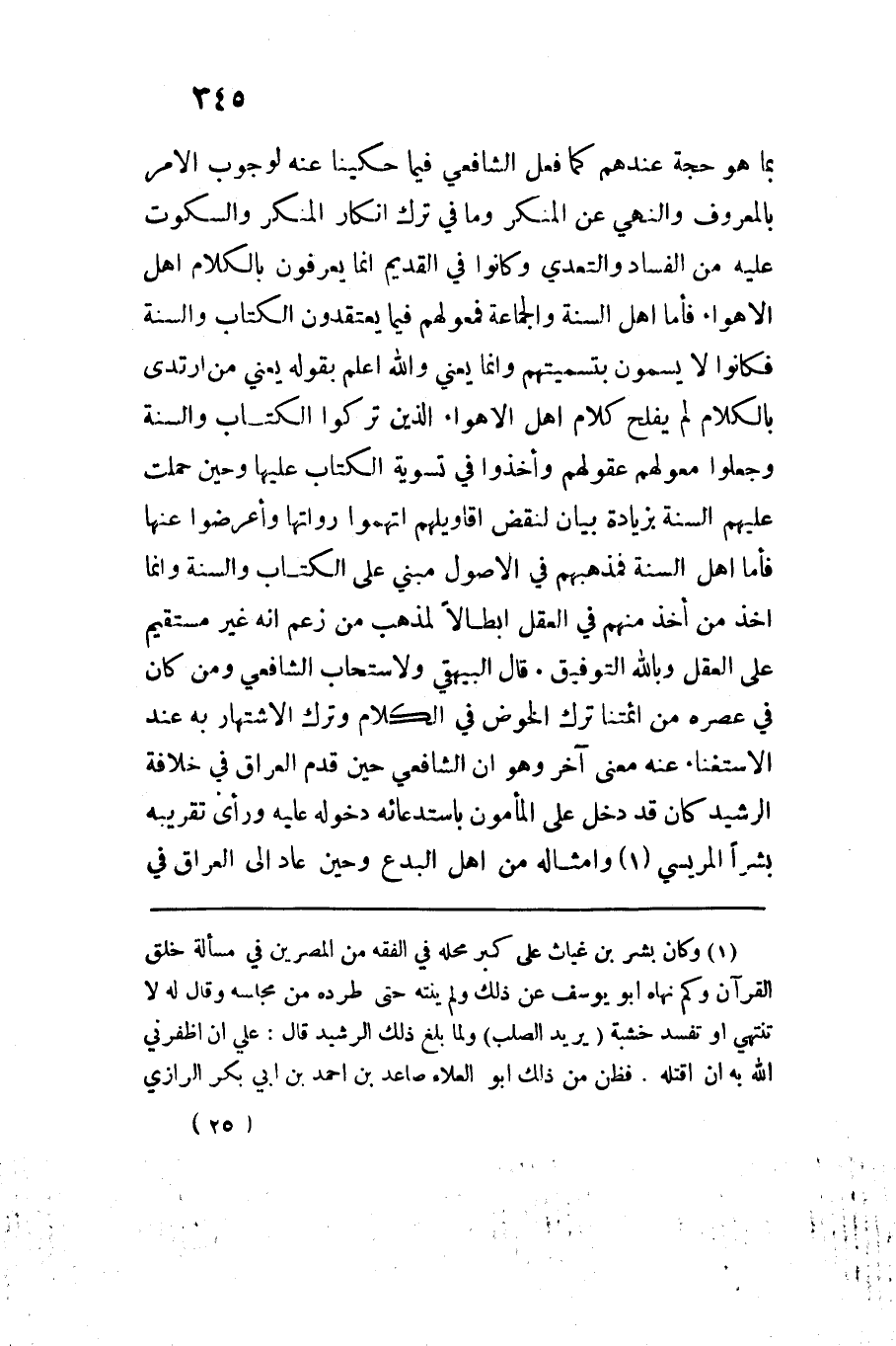 بِمَا هُوَ حجَّة عِنْدهم كَمَا فعل الشَّافِعِي فِيمَا حكينَا عَنهُ لوُجُوب الْأَمر بِالْمَعْرُوفِ وَالنَّهْي عَن الْمُنكر وَمَا فِي ترك إِنْكَار الْمُنكر وَالسُّكُوت عَلَيْهِ من الْفساد والتعدي وَكَانُوا فِي الْقَدِيم إِنَّمَا يعْرفُونَ بالْكلَام أهل الْأَهْوَاء فَأَما أهل السّنة وَالْجَمَاعَة فمعولهم فِيمَا يَعْتَقِدُونَ الْكتاب وَالسّنة فَكَانُوا لَا يسمون بتسميتهم وَإِنَّمَا يَعْنِي واللَّه أعلم بقوله يَعْنِي من ارتدى بالْكلَام لم يفلح كَلَام أهل الْهَوَاء الَّذين تركُوا الْكتاب وَالسّنة وَجعلُوا معولهم عُقُولهمْ وَأخذُوا فِي تَسْوِيَة الْكتاب عَلَيْهَا وَحين حملت عَلَيْهِم السّنة بِزِيَادَة بَيَان لنقض أقاويلهم اتهموا رواتها وأعرضوا عَنْهَا فَأَما أهل السّنة فمذهبهم فِي الْأُصُول مَبْنِيّ على الْكتاب وَالسّنة وَإِنَّمَا أَخذ من أَخذ مِنْهُم فِي الْعقل إبطالا لمَذْهَب من زعم أَنه غير مُسْتَقِيم على الْعقل وبِاللَّهِ التَّوْفِيق