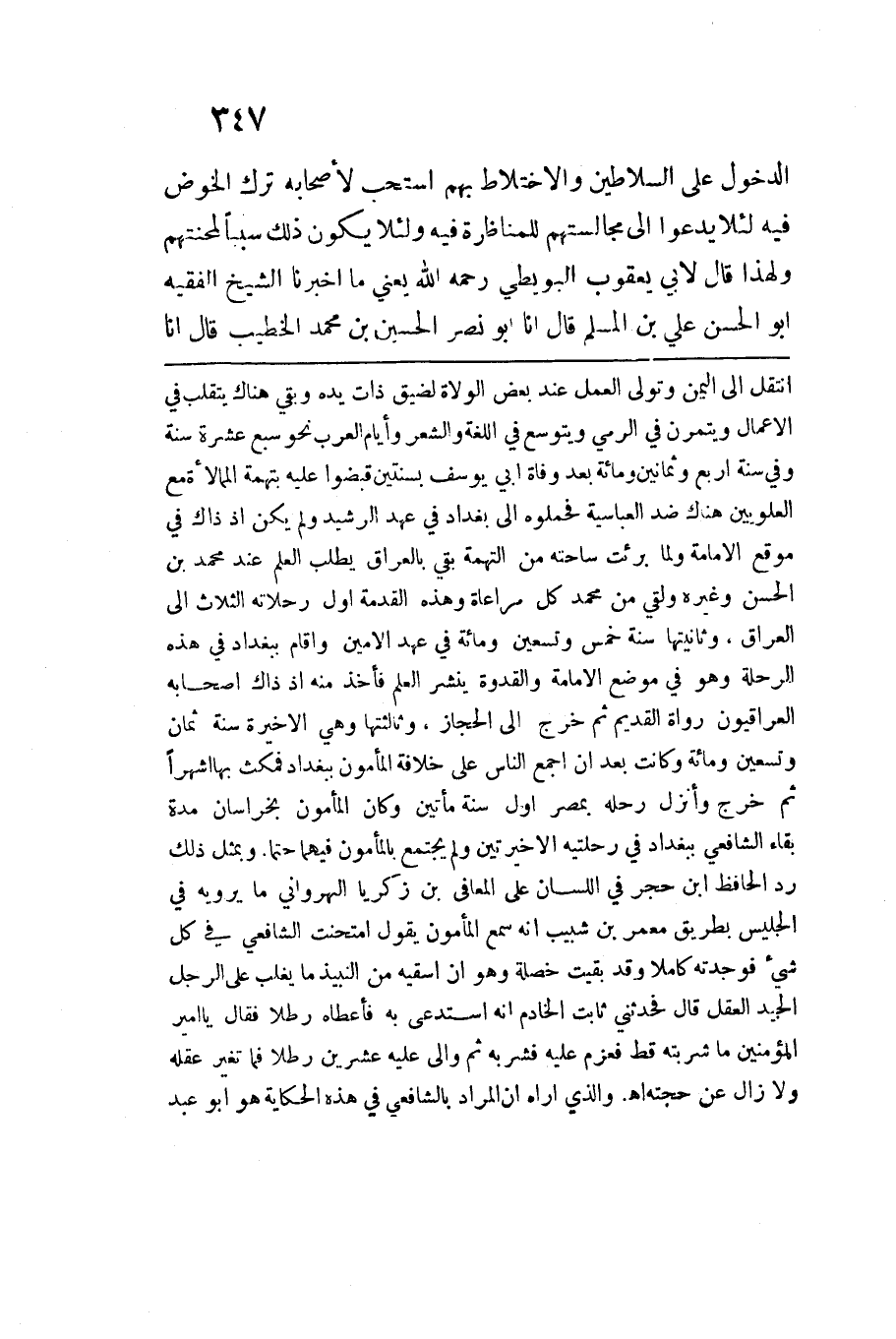 الدُّخُول على السلاطين والاختلاط بهم اسْتحبَّ لأَصْحَابه ترك الْخَوْض فِيهِ لِئَلَّا يدعوا إِلَى مجالستهم للمنَاظرة فِيهِ وَلِئَلَّا يكون ذَلِك سَببا لمحنتهم وَلِهَذَا قَالَ لأبي يَعْقُوب الْبُوَيْطِيّ رَحمَه اللَّه يَعْنِي مَا أَخْبَرَنَا الشَّيْخُ الْفَقِيه أَبُو الْحَسَنِ عَليّ بن الْمُسلم قَالَ أَنا أَبُو نصر الْحُسَيْن بن مُحَمَّدِ الْخَطِيب قَالَ أَنا