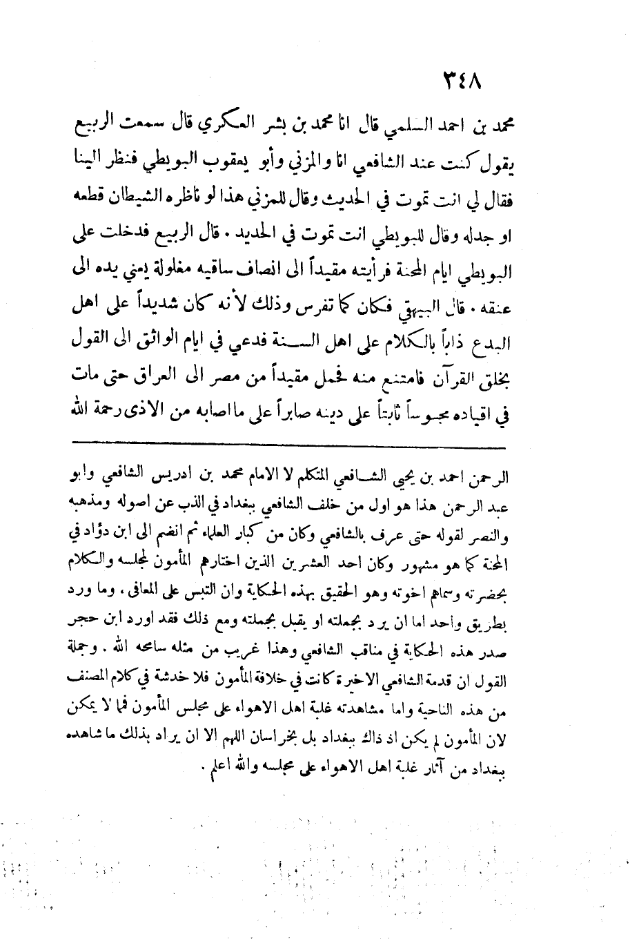 مُحَمَّد بن أَحْمد السّلمِيّ قَالَ انا مُحَمَّدُ بْنُ بشر العكري قَالَ سَمِعت الرّبيع يَقُول كنت عِنْد الشَّافِعِي أنَا والمزني وأَبُو يَعْقُوب الْبُوَيْطِيّ فَنظر إلينَا فَقَالَ لي أَنْت تَمُوت فِي الحَدِيث وَقَالَ للمزني هَذَا لَو نَاظره الشَّيْطَان قطعه أَو جدله وَقَالَ للبويطي أَنْت تَمُوت فِي الْحَدِيد