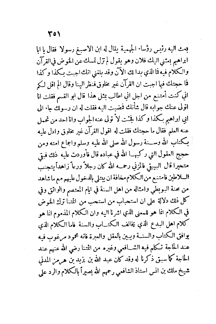 بعث إِلَيْهِ رَئِيس رُؤَسَاء الْجَهْمِية يُقَال لَهُ ابْن الْأَصْبَغ رَسُولا فَقَالَ يَا أَبَا إِبْرَاهِيم بَعَثَنِي إِلَيْك فلَان وَهُوَ يَقُول لم تزل تمسك عَن الْخَوْض فِي الْقُرْآن وَالْكَلَام فِيهِ فَمَا الَّذِي بدا لَك الْآن وَقد بَلغنِي أَنَّك أجبْت بِكَذَا وَكَذَا فَمَا حجتك فِيمَا أجبْت أَن الْقُرْآن غير مَخْلُوق فَنظر إلينَا وَقَالَ ألم أقل لكم أَنِّي كنت أمتنع من أجل أَنِّي أطالب بِمثل هَذَا قَالَ أَبُو الْقسم فَقلت أنَا أتولى عَنْك جَوَابه قَالَ شَأْنك فمضيت إِلَيْهِ فَقلت لَهُ إِن رَسُولك جَاءَ إِلَى أَبِي إِبْرَاهِيم بِكَذَا وَكَذَا فَجئْت لأتولى عَنهُ الْجَواب وأنَا أحد من تحمل عَنهُ الْعلم فَقَالَ مَا حجتك فَقلت لَهُ أَقُول الْقُرْآن غير مَخْلُوق وأدل عَلَيْهِ بِكِتَاب اللَّه وَسنة رَسُول اللَّه صَلَّى اللَّهُ عَلَيْهِ وَسَلَّمَ وَإِجْمَاع أمته وَمن حجج الْعُقُول الَّتِي ركبهَا اللَّه فِي عباده قَالَ فأوردت عَلَيْهِ ذَلِك فَبَقيَ متحيرا قَالَ الْبَيْهَقِيّ فالمزني رَحمَه اللَّه كَانَ رجلا ورعا زاهدا يتَجَنَّب السلاطين فَامْتنعَ من الْكَلَام مَخَافَة أَن يبتلى بِالدُّخُولِ عَلَيْهِم مَعَ مَا شَاهد من محنة الْبُوَيْطِيّ وَأَمْثَاله من أهل السّنة فِي أَيَّام المعتصم والواثق وَفِي كل ذَلِك دلَالَة على أَن اسْتِحْبَاب من اسْتحبَّ من أئمتنَا ترك الْخَوْض فِي الْكَلَام إِنَّمَا هُوَ للمعني الَّذِي أشرنَا إِلَيْهِ وَأَن الْكَلَام المذموم إِنَّمَا هُوَ كَلَام أهل الْبدع الَّذِي يُخَالف الْكتاب وَالسّنة فَأَما الْكَلَام الَّذِي يُوَافق الْكتاب وَالسّنة وَيبين بِالْعقلِ وَالْعبْرَة فَإِنَّهُ مَحْمُود مَرْغُوب فِيهِ عِنْد الْحَاجة تكلم فِيهِ الشَّافِعِي وَغَيره من أئمتنَا رَضِيَ اللَّهُ عَنْهُم عِنْد الْحَاجة كَمَا سبق ذكرنَا لَهُ وَقد كَانَ عَبْد اللَّهِ بن يزِيد بن هُرْمُز الْمدنِي شيخ مَالك بن أنس أستاذ الشَّافِعِي رَحِمهم اللَّه بَصيرًا بالْكلَام وَالرَّدّ على