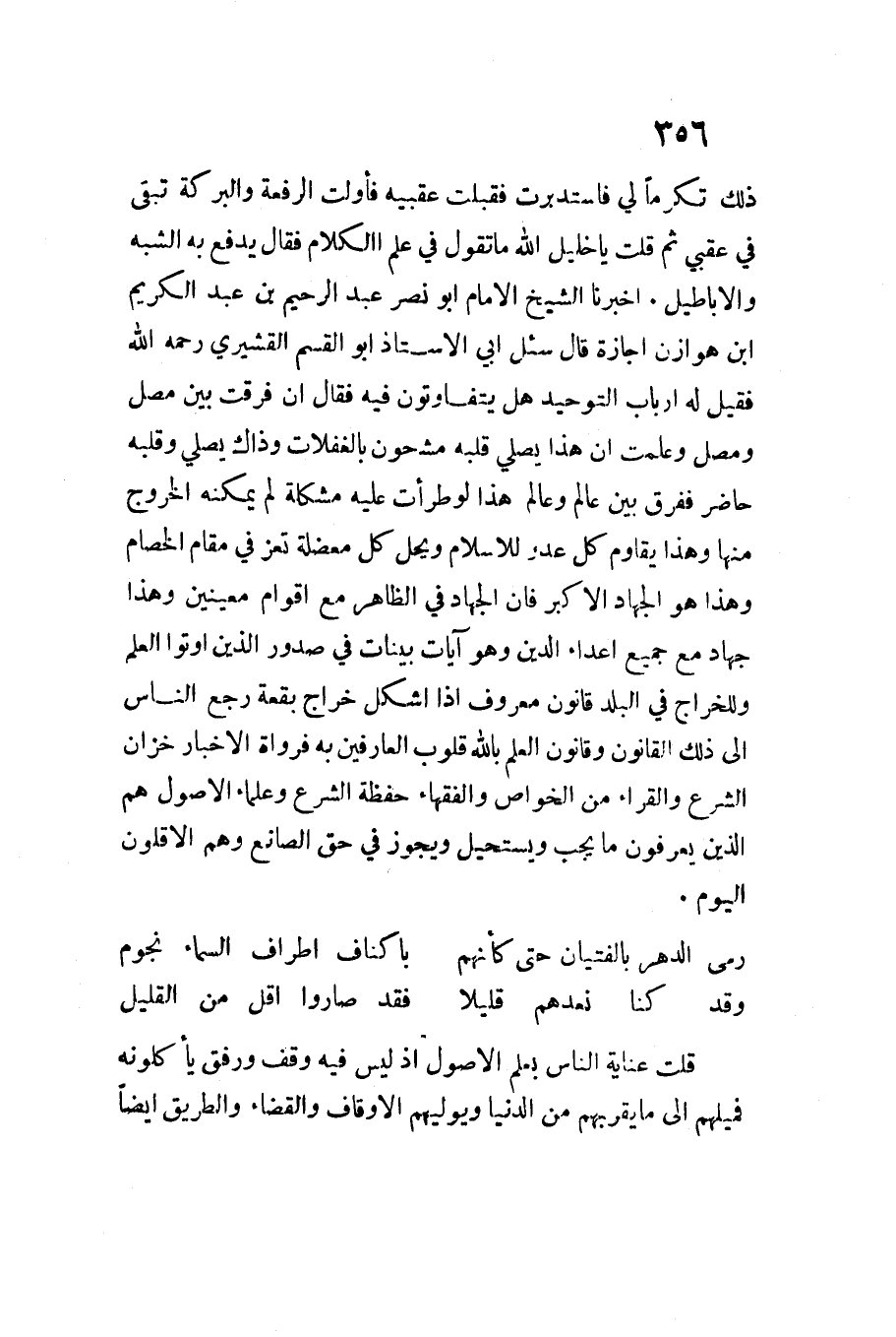 أَخْبَرَنَا الشَّيْخُ الإِمَام أَبُو نصر عبد الرَّحِيم بن عبد الْكَرِيم ابْن هوَازن إجَازَة قَالَ سُئِلَ أَبِي لأستاذ ابو الْقسم الْقشيرِي رَحمَه اللَّه فَقيل لَهُ أَرْبَاب التَّوْحِيد هَل يتفاوتون فِيهِ فَقَالَ إِن فرقت بَين مصل ومصل وَعلمت أَن هَذَا يُصَلِّي قلبه مشحون بالغفلات وَذَاكَ يُصَلِّي وَقَلبه حَاضر فَفرق بَين عَالم وعالم هَذَا لَو طرأت عَلَيْهِ مشكلة لم يُمكنهُ الْخُرُوج مِنْهَا وَهَذَا يُقَاوم كل عَدو لِلْإِسْلَامِ وَيحل كل معضلة تعز فِي مقَام الْخِصَام وَهَذَا هُوَ الْجِهَاد الْأَكْبَر فَإِن الْجِهَاد فِي الظَّاهِر مَعَ أَقوام مُعينين وَهَذَا جِهَاد مَعَ جَمِيع أَعدَاء الدّين وَهُوَ آيَاتٌ بَيِّنَاتٌ فِي صُدُورِ الَّذِينَ أُوتُوا الْعلم وللخراج فِي الْبَلَد قانون مَعْرُوف إِذَا أشكل خراج بقْعَة رَجَعَ النَّاس إِلَى ذَلِك القانون وقانون الْعلم بِاللَّهِ قُلُوب العارفين بِهِ فَرُواة الْأَخْبَار خزان الشَّرْع والقراء من الْخَواص وَالْفُقَهَاء حفظَة الشَّرْع وعلماء الْأُصُول هم الَّذين يعْرفُونَ مَا يجب ويستحيل وَيجوز فِي حق الصَّانِع وهم الأقلون الْيَوْم ... رمى الدَّهْر بالفتيان حَتَّى كَأَنَّهُمْ