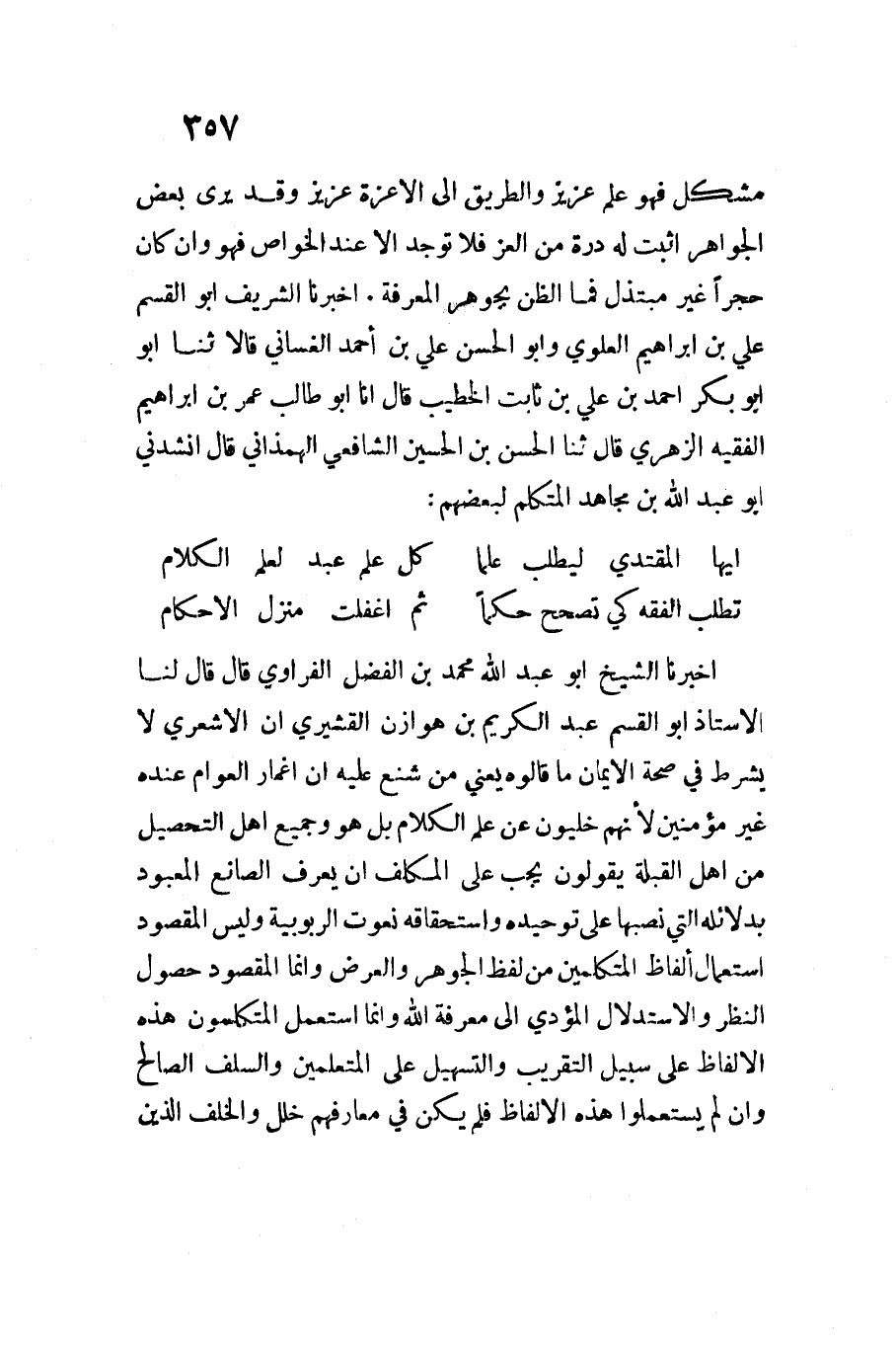 أَخْبَرَنَا الشَّيْخُ أَبُو عَبْدِ اللَّهِ مُحَمَّدُ بْنُ الْفَضْلِ الفراوي قَالَ قَالَ لنَا الْأُسْتَاذ أَبُو الْقسم عَبْدِ الْكَرِيم بن هوَازن الْقشيرِي أَن الْأَشْعَرِيّ لَا يشرط فِي صِحَة الْإِيمَان مَا قَالُوهُ يَعْنِي من شنع عَلَيْهِ أَن أغمار الْعَوام عِنْده غير مُؤمنين لأَنهم خليون عَن علم الْكَلَام بل هُوَ وَجَمِيع أهل التَّحْصِيل من أهل الْقبْلَة يَقُولُونَ يجب على الْمُكَلف أَن يعرف الصَّانِع المعبود بدلائله الَّتِي نصبها على توحيده واستحقاقه نعوت الربوبية وَلَيْسَ الْمَقْصُود اسْتِعْمَال أَلْفَاظ الْمُتَكَلِّمين من لفظ الْجَوْهَر وَالْعرض وَإِنَّمَا الْمَقْصُود حُصُول النّظر وَالِاسْتِدْلَال الْمُؤَدِّي إِلَى معرفَة اللَّه وَإِنَّمَا اسْتعْمل المتكلمون هَذِهِ الْأَلْفَاظ على سَبِيل التَّقْرِيب والتسهيل على المتعلمين وَالسَّلَف الصَّالح وَإِن لم يستعملوا هَذِهِ الْأَلْفَاظ فَلم يكن فِي معارفهم خلل والخَلَف الَّذين