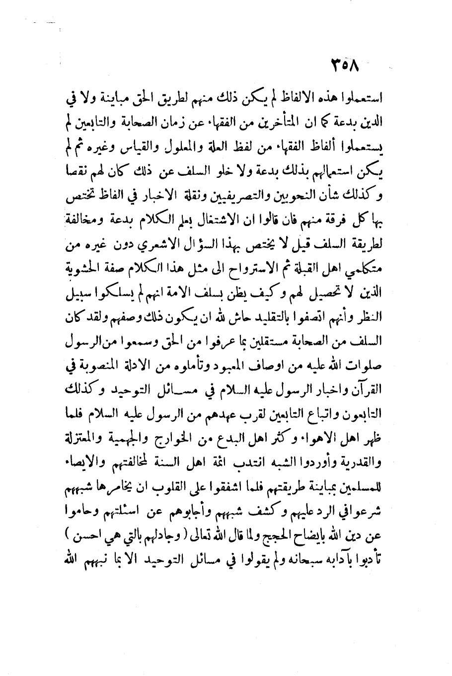 استعملوا هَذِهِ الْأَلْفَاظ لم يكن ذَلِك مِنْهُم لطريق الْحق مباينة وَلَا فِي الدّين بِدعَة كَمَا أَن الْمُتَأَخِّرين من الْفُقَهَاء عَن زمَان الصَّحَابَة وَالتَّابِعِينَ لم يستعملوا أَلْفَاظ الْفُقَهَاء من لفظ الْعلَّة والمعلول وَالْقِيَاس وَغَيره ثمَّ لم يكن استعمالهم بذلك بِدعَة وَلَا خلو السّلف عَن ذَلِك كَانَ لَهُم نقصا وَكَذَلِكَ شَأْن النَّحْوِيين والتصريفيين ونقلة الْأَخْبَار فِي أَلْفَاظ تخْتَص بهَا كل فرقة مِنْهُم فَإِن قَالُوا إِن الِاشْتِغَال بِعلم الْكَلَام بِدعَة وَمُخَالفَة لطريقة السّلف قيل لَا يخْتَص بِهَذَا السُّؤَال الْأَشْعَرِيّ دون غَيره من متكلمي أهل الْقبْلَة ثمَّ الاسترواح إِلَى مثل هَذَا الْكَلَام صفة الحشوية الَّذين لَا تَحْصِيل لَهُم وَكَيف يظنّ بسلف الْأمة أَنهم لم يسلكوا سَبِيل النّظر وَأَنَّهُمْ اتصفوا بالتقليد حاش لِلَّه أَن يكون ذَلِك وَصفهم وَلَقَد كَانَ السّلف من الصَّحَابَة مستقلين بِمَا عرفُوا من الْحق وسمعوا من الرَّسُول صلوَات اللَّه عَلَيْهِ من أَوْصَاف المعبود وتأملوه من الْأَدِلَّة المنصوبة فِي الْقُرْآن وأخبار الرَّسُول عَلَيْهِ السَّلَام فِي مسَائِل التَّوْحِيد وَكَذَلِكَ التابعون وَأَتْبَاع التَّابِعين لقرب عَهدهم من الرَّسُول عَلَيْهِ السَّلَام فَلَمَّا ظهر أهل الْأَهْوَاء وَكثر أهل الْبدع من الْخَوَارِج والجهمية والمعتزلة والقدرية وأوردوا الشّبَه انتدب أَئِمَّة أهل السّنة لمخالفتهم والإيصاء للْمُسلمين بمباينة طريقتهم فَلَمَّا أشفقوا على الْقُلُوب أَن يخامرها شبههم شرعوا فِي الرَّد عَلَيْهِم وكشف شبههم وأجابوهم عَن أسئلتهم وحاموا عَن دين اللَّه بإيضاح الْحجَج وَلما قَالَ اللَّه تَعَالَى {وَجَادِلْهُمْ بِالَّتِي هِيَ أحسن} تأدبوا بآدابه سُبْحَانَهُ وَلم يَقُولُوا فِي مسَائِل التَّوْحِيد إِلَّا بِمَا نبههم اللَّه