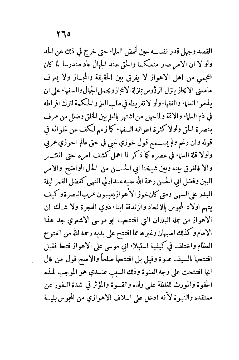 القصيد وَجَهل قدر نَفسه حِين غمض الْعلمَاء حَتَّى خرج فِي ذَلِك عَن الْحَد وَلَوْلَا أَن الْأَمر صَار منعكسا وَالْحق عِنْد الْجُهَّال عَاد مندرسا لما كَانَ أعجمي من أهل الأهواز لَا يفرق بَين الْحَقِيقَة وَالْمجَاز وَلَا يعرف مَا معنى الإيجاز ينزل الرؤوس بِمَنْزِلَة الأعجاز وَيحمل الْجُهَّال السُّفَهَاء على أَن يذموا الْعلمَاء وَالْفُقَهَاء وَلَوْلَا تفريطه فِي طلب الْعلم وَالْحكمَة لترك إفراطه فِي ذمّ الْعلمَاء وَالْأَئِمَّة وَلما جهل من اشْتهر بِالْعلمِ بَين الْخلق وضلل من عرف بنصرة الْحق وَلَوْلَا كَثْرَة أعوانه السُّفَهَاء كَمَا زعم لكف عَن غلوائه فِي قَوْله وَإِن رغم وَلم يسمع قَول خوزي غبي فِي حق عَالم أحوزي عَرَبِيّ وَلَوْلَا قلَّة الْعلمَاء فِي عصره كَمَا ذكر لما أهمل كشف أمره حَتَّى انْتَشَر وَإِلَّا فَالْفرق بَينه وَبَين شيخنَا أَبِي الْحسن من الْحَال الْوَاضِح وَالْأَمر الْبَين وَفضل أَبِي الْحسن رَحْمَة اللَّه عَلَيْهِ عِنْد أولى النَّهْي كفضل الْقَمَر لَيْلَة الْبَدْر على السَّهْمِي وَمَتى كَانَ حوز الأهواز يعيبون عرب الْبَصْرَة وَكَيف يتهم أَوْلَاد الْمَجُوس بالإلحاد والزندقة أبْنَاء ذَوي الْهِجْرَة وَلَا شكّ أَن الأهواز من جملَة الْبلدَانِ الَّتِي افتتحها أَبُو مُوسَى الْأَشْعَرِيّ جد هَذَا الإِمَام وَكَذَلِكَ أَصْبَهَان وَغَيرهَا مِمَّا افْتتح على يَدَيْهِ رَحمَه اللَّه من الْفتُوح الْعِظَام وَاخْتلف فِي كَيْفيَّة اسْتِيلَاء أَبِي مُوسَى على الأهواز فتحا فَقيل افتتحها بِالسَّيْفِ عنْوَة وَقيل بل افتتحها صلحا وَالأَصَح قَول من قَالَ إِنَّهَا افتتحت على وَجه العنوة وَذَلِكَ السَّبَب عِنْدِي هُوَ الْمُوجب لهَذِهِ الحفوة والمورث للغلطة على وَلَده وَالْقَسْوَة والمؤثر فِي شدَّة النفور عَن معتقده والنبوة لِأَنَّهُ أَدخل على أسلاف الْأَهْوَازِي من الْمَجُوس بلية