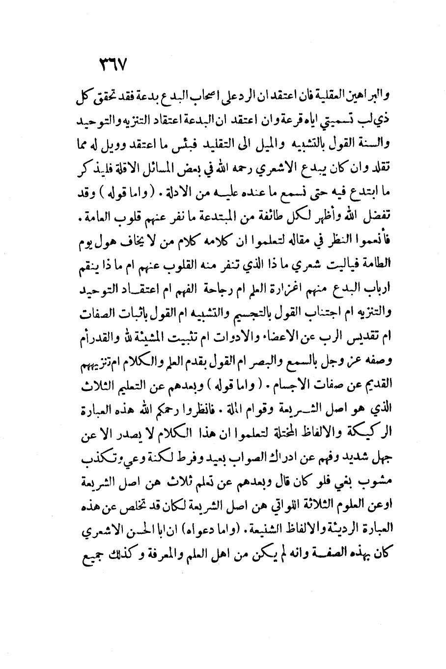 والبراهين الْعَقْلِيَّة فَإِن اعْتقد أَن الرَّد على أَصْحَاب الْبدع بِدعَة فقد تحقق كل ذِي لب تسميتي إِيَّاه قرعَة وَإِن اعْتقد أَن الْبِدْعَة اعْتِقَاد التَّنْزِيه والتوحيد وَالسّنة القَوْل بالتشبيه والميل إِلَى التَّقْلِيد فبئس مَا اعْتقد وويل لَهُ مِمَّا تقلد وَإِن كَانَ يبدع الْأَشْعَرِيّ رَحمَه اللَّه فِي بعض الْمسَائِل إِلَّا قلَّة فليذكر مَا ابتدع فِيهِ حَتَّى نسْمع مَا عِنْده عَلَيْهِ من الْأَدِلَّة