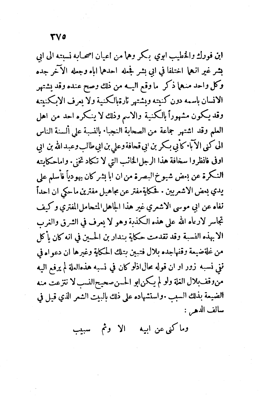 ابْن فورك والخطيب أَبَوي بكر وهما من أعَان أَصْحَابه نسبته إِلَى أَبِي بشر غير أَنَّهُمَا اخْتلفَا فِي أَبِي بشر فَجعله أَحدهمَا أَبَاهُ وَجعله الآخر جده وكل وَاحِد مِنْهُمَا ذكر مَا وَقع إِلَيْهِ من ذَلِك وَصَحَّ عِنْده وَقد يشْتَهر الْإِنْسَان باسمه دون كنيته ويشتهر تَارَة بالكنية وَلَا يعرف إِلَّا بكنيته وَقد يكون مَشْهُورا بالكنية وَالِاسْم وَذَلِكَ لَا يُنكره أحد من أهل الْعلم وَقد اشْتهر جمَاعَة من الصَّحَابَة النجباء بِالنِّسْبَةِ على أَلْسِنَة النَّاس إِلَى كني الْآبَاء كَأبي بكر بن أَبِي قُحَافَة وَعلي بن أَبِي طَالب وعَبْد اللَّهِ بن أَبِي أوفى فانظروا سخافة هَذَا الرجل الخائب الَّتِي لَا تكَاد تخفى