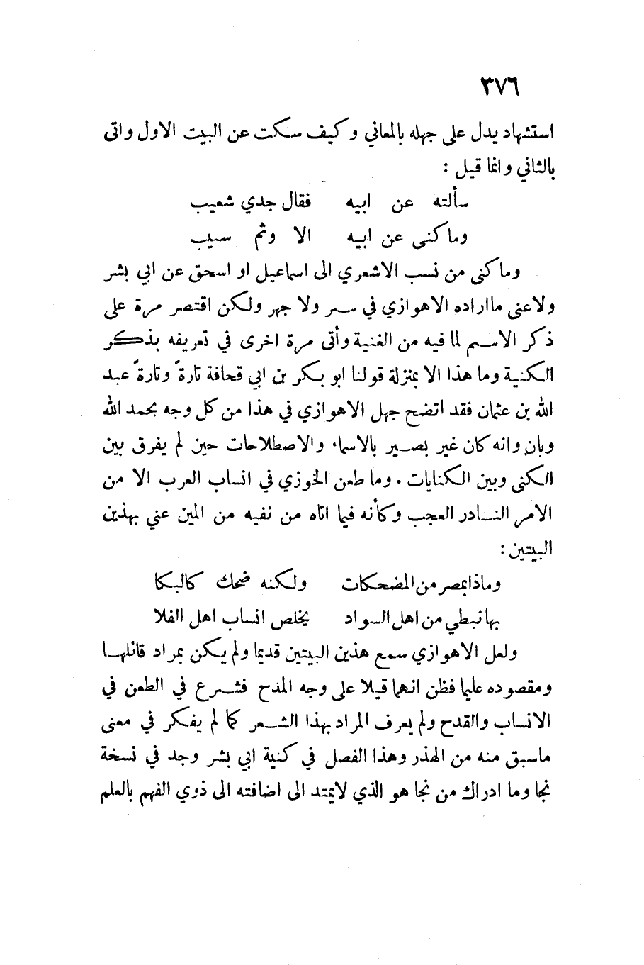 وَلَعَلَّ الْأَهْوَازِي سمع هذَيْن الْبَيْتَيْنِ قَدِيما وَلم يكن بِمُرَاد قَائِلهَا ومقصودة عليما فَظن أَنَّهُمَا قيلا على وَجه الْمَدْح فشرع فِي الطعْن فِي الْأَنْسَاب والقدح وَلم يعرف المُرَاد بِهَذَا الشّعْر كَمَا لم يفكر فِي معني مَا سبق مِنْهُ من الهذر وَهَذَا الْفَصْل فِي منية أَبِي بشر وجد فِي نُسْخَة نجا وَمَا أَدْرَاك من نجا هُوَ الَّذِي لَا يَمْتَد إِلَى إِضَافَته إِلَى ذَوي الْفَهم بِالْعلمِ