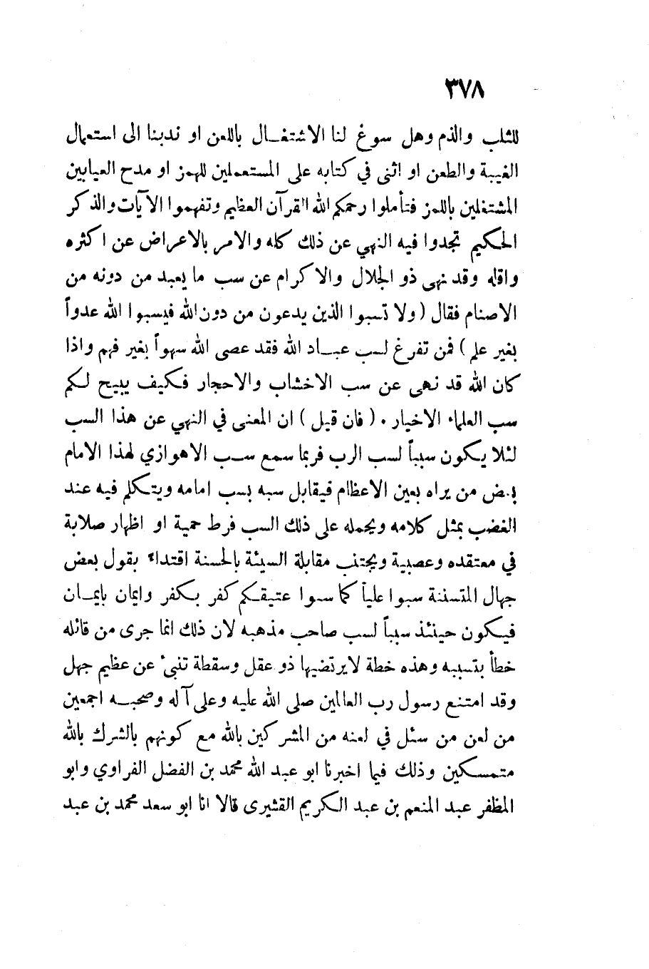 فَإِن قيل إِن الْمَعْنى فِي النَّهْي عَن هَذَا السب لِئَلَّا يكون سَببا لسب الرب فَرُبمَا سمع سبّ الْأَهْوَازِي لهَذَا الإِمَام بعض من يرَاهُ بِعَين الإعظام فيقابل سبه بسب إِمَامه وَيتَكَلَّم فِيهِ عِنْد الْغَضَب بِمثل كَلَامه ويحمله على ذَلِك السب فرط حمية أَو إِظْهَار صلابة فِي معتقده وعصبية ويجتنب مُقَابلَة السَّيئَة بِالْحَسَنَة اقْتِدَاء بقول بعض جهال المتسننة سبوا عليا كَمَا سبوا عتيقكم كفر بِكفْر وإيمان بِإِيمَان فَيكون حِينَئِذٍ سَببا لسب صَاحب مذْهبه لِأَن ذَلِك إِنَّمَا جرى من قَائِله خطأ بتسببه وَهَذِه خطة لَا يرتضيها ذُو عقل وسقطة تنبىء عَن عَظِيم جهل وَقد امْتنع رَسُول رب الْعَالمين صلى اللَّه عَلَيْهِ وعَلى آله وَصَحبه أَجْمَعِينَ من لعن مَنْ سُئل فِي لَعنه من الْمُشْركين بِاللَّهِ مَعَ كَونهم بالشرك بِاللَّهِ مُتَمَسِّكِينَ وَذَلِكَ فِيمَا أَخْبَرَنَا أَبُو عَبْدِ اللَّهِ مُحَمَّدُ بْنُ الْفَضْلِ الْفُرَاوِيُّ وَأَبُو الْمُظَفَّرِ عَبْدُ الْمُنْعِمِ بْنُ عَبْدِ الْكَرِيم الْقشيرِي قَالَا أَنا أَبُو سَعْدٍ مُحَمَّدُ بْنُ عَبْدِ