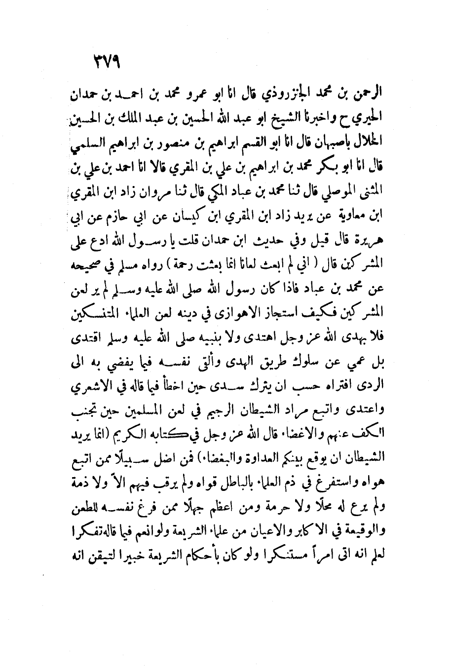 إِنِّي لَمْ أُبْعَثْ لَعَّانًا إِنَّمَا بُعِثْتُ رَحْمَةً رَوَاهُ مُسْلِمٌ فِي صَحِيحِهِ عَنْ مُحَمَّدِ بْنِ عَبَّادٍ فَإِذا كَأَن رَسُول اللَّه صَلَّى اللَّهُ عَلَيْهِ وَسَلَّمَ لم ير لعن الْمُشْركين فَكيف استجاز الْأَهْوَازِي فِي دينه لعن الْعلمَاء المتنسكين فَلَا بِهَدي اللَّه عَزَّ وَجَلَّ اهْتَدَى وَلَا بِنَبِيِّهِ صَلَّى اللَّهُ عَلَيْهِ وَسَلَّمَ اقْتدى بل عمي عَن سلوك طَرِيق الْهدى وَألقى نَفسه فِيمَا يفضى بِهِ إِلَى الردى أفتراه حسب أَن يتْرك سدى حِين أَخطَأ فِيمَا قَالَه فِي الْأَشْعَرِيّ واعتدي وَاتبع مُرَاد الشَّيْطَان الرَّجِيم فِي لعن الْمُسلمين حِين تجنب الْكَفّ عَنْهُم والإغضاء قَالَ الله عزوجل فِي كِتَابه الْكَرِيم {إِنَّمَا يُرِيدُ الشَّيْطَانُ أَنْ يُوقِعَ بَيْنَكُمُ الْعَدَاوَةَ والبغضاء} فَمن أضلّ سَبِيلا مِمَّن اتبع هَوَاهُ واستفرغ فِي ذمّ الْعلمَاء بِالْبَاطِلِ قواه وَلم يرقب فيهم إِلَّا وَلَا ذمَّة وَلم يرعَ لَهُ محلا وَلَا حُرْمَة ومَنْ أعظم جهلا مِمَّن فرغ نَفسه لِلطَّعْنِ والوقيعة فِي الأكابر والأعيان من عُلَمَاء الشَّرِيعَة وَلَو أنعم فِيمَا قَالَه تفكرا لعلم أَنه أَتَى أمرا مستنكرا وَلَو كَانَ بِأَحْكَام الشَّرِيعَة خَبِيرا لتيقن أَنه