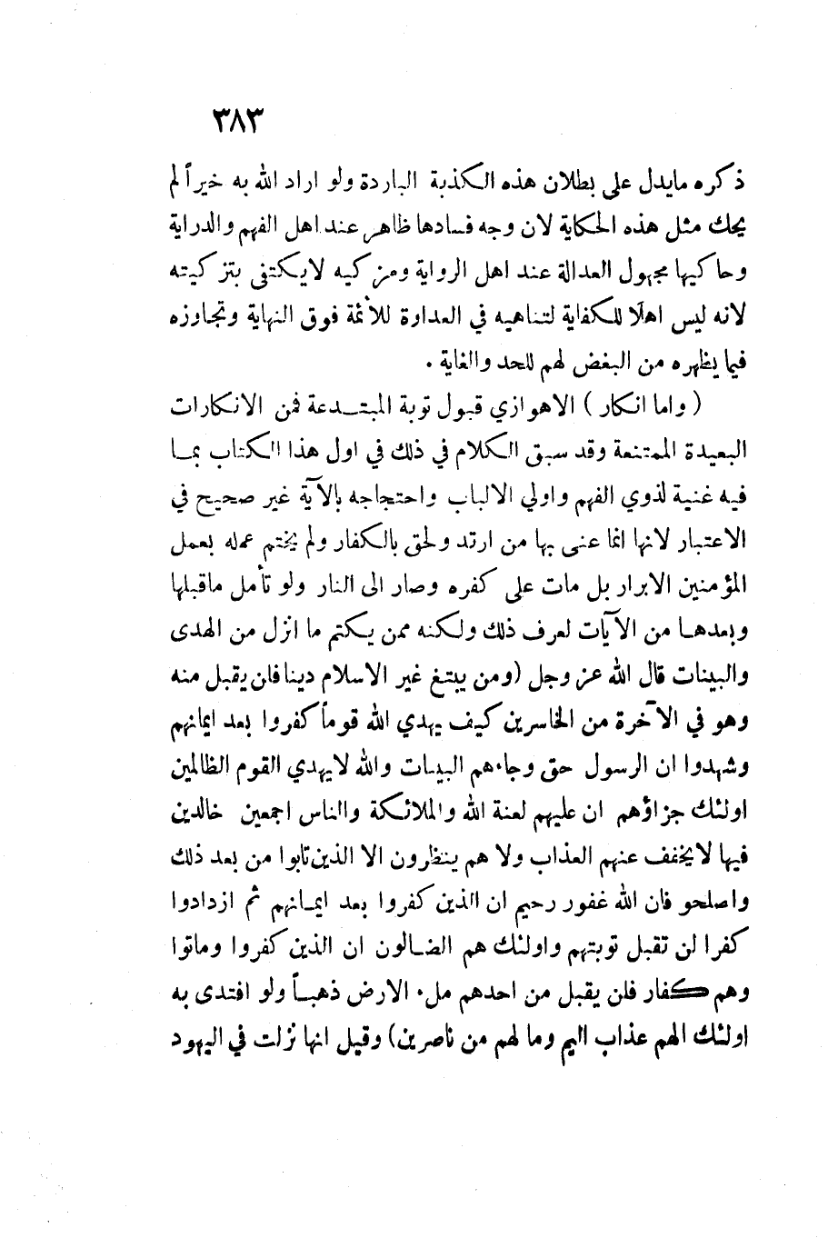 وَأما إِنْكَار الْأَهْوَازِي قبُول تَوْبَة المبتدعة فَمن الإنكارات الْبَعِيدَة الممتنعة وَقد سبق الْكَلَام فِي ذَلِك فِي أول هَذَا الْكتاب بِمَا فِيهِ غنية لِذَوي الْفَهم وَأولى الْأَلْبَاب واحتجاجه بِالْآيَةِ غير صَحِيح فِي الِاعْتِبَار لِأَنَّهَا إِنَّمَا عني بهَا من ارْتَدَّ وَلحق بالكفار وَلم يخْتم عمله بِعَمَل الْمُؤمنِينَ الْأَبْرَار بل مَاتَ على كفره وَصَارَ إِلَى النَّار وَلَو تَأمل مَا قبلهَا وَبعدهَا من الْآيَات لعرف ذَلِك وَلكنه مِمَّن يكتم مَا أنزل من الْهدى والبينَات قَالَ اللَّه عزوجل {وَمَنْ يَبْتَغِ غَيْرَ الإِسْلامِ دِينًا فَلَنْ يُقْبَلَ مِنْهُ وَهُوَ فِي الآخِرَةِ مِنَ الْخَاسِرِينَ كَيْفَ يَهْدِي اللَّهُ قَوْمًا كَفَرُوا بَعْدَ إِيمَانِهِمْ وَشَهِدُوا أَنَّ الرَّسُولَ حَقٌّ وَجَاءَهُمُ الْبَيِّنَاتُ وَاللَّهُ لَا يَهْدِي الْقَوْمَ الظَّالِمِينَ أُولَئِكَ جَزَاؤُهُمْ أَنَّ عَلَيْهِمْ لَعْنَةَ اللَّهِ وَالْمَلائِكَةِ وَالنَّاسِ أَجْمَعِينَ خَالِدِينَ فِيهَا لَا يُخَفَّفُ عَنْهُمُ الْعَذَابُ وَلا هُمْ يُنْظَرُونَ إِلا الَّذِينَ تَابُوا مِنْ بَعْدِ ذَلِكَ وَأَصْلَحُوا فَإِنَّ اللَّهَ غَفُورٌ رَحِيمٌ إِنَّ الَّذِينَ كَفَرُوا بَعْدَ إِيمَانِهِمْ ثُمَّ ازْدَادُوا كُفْرًا لَنْ تُقْبَلَ تَوْبَتُهُمْ وَأُولَئِكَ هُمُ الضَّالُّونَ إِنَّ الَّذِينَ كَفَرُوا وَمَاتُوا وَهُمْ كُفَّارٌ فَلَنْ يُقْبَلَ مِنْ أَحَدِهِمْ مِلْءُ الأَرْضِ ذَهَبًا وَلَوِ افْتَدَى بِهِ أُولَئِكَ لَهُمْ عَذَابٌ أَلِيمٌ وَمَا لَهُم من ناصرين} وَقيل إِنَّهَا نزلت فِي الْيَهُود