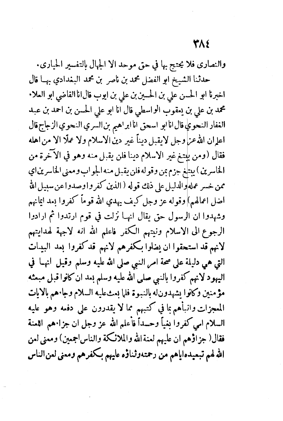 حَدَّثَنَا الشَّيْخُ أَبُو الْفَضْلِ مُحَمَّدُ بْنُ نَاصِرِ بْنِ مُحَمَّدٍ الْبَغْدَادِيّ بهَا قَالَ أَخْبَرَنَا أَبُو الْحَسَنِ عَلِيُّ بْنُ الْحُسَيْنِ بْنِ عَليّ بن أَيُّوب قَالَ أَنا الْقَاضِي أَبُو الْعَلَاء مُحَمَّد بن يَعْقُوب الوَاسِطِيّ قَالَ أَنا أَبُو عَلِيٍّ الْحَسَنُ بْنُ أَحْمَدَ بْنِ عَبْدِ الْغفار النَّحْوِيّ قَالَ أَنا أَبُو اسحق أَنا إِبْرَاهِيمُ بْنُ السَّرِيِّ النَّحْوِيّ الزّجاج قَالَ أعلم أَن الله عزوجل لَا يقبل دينا غير دين الْإِسْلَام وَلَا عملا إِلَّا من أَهله فَقَالَ {وَمَنْ يَبْتَغِ غَيْرَ الإِسْلامِ دِينًا فَلَنْ يُقْبَلَ مِنْهُ وَهُوَ فِي الآخِرَةِ مِنَ الْخَاسِرِينَ} يبتغ جزم بِمن وَقَوله فَلَنْ يقبل مِنْهُ الْجَواب ومعني الخاسرين أَي مِمَّن خسر عمله وَالدَّلِيل على ذَلِك قَوْله {الَّذين كفرُوا وصدوا عَن سَبِيل الله أضلّ أَعْمَالهم} وَقَوله عزوجل كَيْفَ يَهْدِي اللَّهُ قَوْمًا كَفَرُوا بَعْدَ إِيمَانِهِمْ وَشَهِدُوا أَنَّ الرَّسُولَ حق يُقَال إِنَّهَا نزلت فِي قوم ارْتَدُّوا ثمَّ أَرَادوا الرُّجُوع إِلَى الْإِسْلَام ونيتهم الْكفْر فَأعْلم اللَّه أَنه لَا جِهَة لهدايتهم لأَنهم قد استحقوا أَن يضلوا بكفرهم لأَنهم قد كفرُوا بعد البينَات الَّتِي هِيَ دليلة على صِحَة أَمر النَّبِي صَلَّى اللَّهُ عَلَيْهِ وَسَلَّمَ وَقيل إِنَّهَا فِي الْيَهُود لأَنهم كفرُوا بِالنَّبِيِّ صَلَّى اللَّهُ عَلَيْهِ وَسلم بعد كَانُوا قبل مبعثه مُؤمنين وَكَانُوا يشْهدُونَ لَهُ بالبنبوة فَلَمَّا بعث عَلَيْهِ السَّلَام وجاءهم بِالْآيَاتِ المعجزات وأنبأهم بِمَا فِي كتبهمْ مِمَّا لايقدرون على دَفعه وَهُوَ عَلَيْهِ السَّلَام أُمِّي كفرُوا بغيا وحسدا فَأعْلم الله عزوجل أَن جزاءهم اللَّعْنَة فَقَالَ {جَزَاؤُهُمْ أَنَّ عَلَيْهِمْ لَعْنَةَ اللَّهِ وَالْمَلائِكَةِ وَالنَّاس أَجْمَعِينَ} وَمعنى لعن اللَّه لَهُم تبعيده إيَّاهُم من رَحمته وثنَاؤه عَلَيْهِم بكفرهم وَمعنى لعن النَّاس