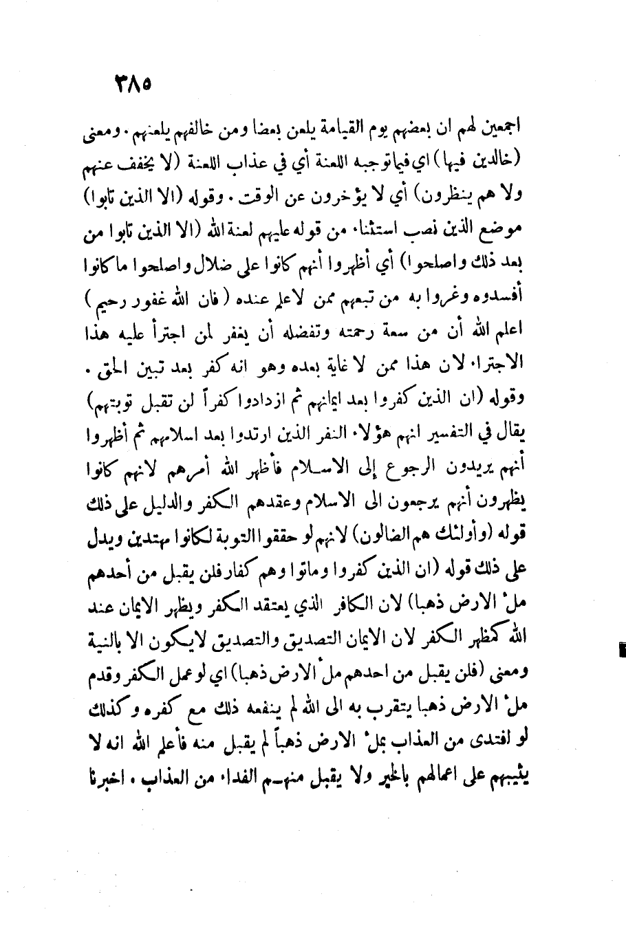 وَقَوله {إِنَّ الَّذِينَ كَفَرُوا بَعْدَ إِيمَانِهِمْ ثُمَّ ازْدَادُوا كُفْرًا لن تقبل تَوْبَتهمْ} يُقَال فِي التَّفْسِير إِنَّهُم هَؤُلَاءِ النَّفر الَّذِي ارْتَدُّوا بعد إسْلَامهمْ ثمَّ أظهرُوا أَنهم يُرِيدُونَ الرُّجُوع إِلَى الْإِسْلَام فأظهر اللَّه أَمرهم لأَنهم كَانُوا يظهرون أَنهم يرجعُونَ إِلَى الْإِسْلَام وعقدهم الْكفْر وَالدَّلِيل على ذَلِك قَوْله {وَأُولَئِكَ هم الضالون} لأَنهم لَو حققوا التَّوْبَة لكانوا مهتدين وَيدل على ذَلِك قَوْله {إِنَّ الَّذِينَ كَفَرُوا وَمَاتُوا وَهُمْ كُفَّارٌ فَلَنْ يُقْبَلَ مِنْ أَحَدِهِمْ ملْء الأَرْض ذَهَبا} لِأَن الْكَافِر الَّذِي يعْتَقد الْكفْر وَيظْهر الْإِيمَان عِنْد اللَّه كمظهر الْكفْر لِأَن الْإِيمَان التَّصْدِيق والتصديق لَا يكون إِلَّا بِالنِّيَّةِ ومعني {فَلَنْ يُقْبَلَ مِنْ أَحَدِهِمْ مِلْءُ الأَرْض ذَهَبا} أَي لَو عمل الْكفْر وَقدم ملْء الأَرْض ذَهَبا يتَقرَّب بِهِ إِلَى اللَّه لم يَنْفَعهُ ذَلِك مَعَ كفره وَكَذَلِكَ لَو افتدى من الْعَذَاب بملء الأَرْض ذَهَبا لم يقبل مِنْهُ فَأعْلم اللَّه أَنه لَا يثيبهم على أَعْمَالهم بِالْخَيرِ وَلَا يقبل مِنْهُم الْفِدَاء من الْعَذَاب