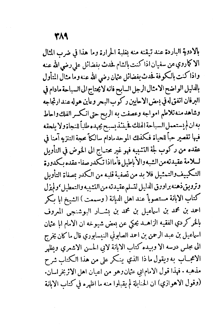 بالأدوية الْبَارِدَة عِنْد تيقنه مِنْهُ بِغَلَبَة الْحَرَارَة وَمَا هَذَا فِي ضرب الْمِثَال إِلَّا كَمَا رُوِيَ عَن سُفْيَان إِذَا كنت بِالشَّام فَحدث بفضائل عَليّ رَضِيَ اللَّهُ عَنْهُ وَإِذا كنت بِالْكُوفَةِ فَحدث بفضائل عُثْمَان رَضِيَ اللَّهُ عَنْهُ وَمَا مِثَال المتأول بِالدَّلِيلِ الْوَاضِح إِلَّا مِثَال الرجل السابح فَإِنَّهُ لَا يحْتَاج إِلَى السباحة مَا دَامَ فِي البرفان اتّفق لَهُ فِي بعض الْأَحَايِين ركُوب الْبَحْر وعاين هُوَ لَهُ عِنْد ارتجاجه وَشَاهد مِنْهُ تلاطم أمواجه وعصفت بِهِ الرّيح حَتَّى انْكَسَرَ الْفلك وأحاط بِهِ إِن لم يسْتَعْمل السباحة الهلك فَحِينَئِذٍ يسبح بِجهْدِهِ طلبا للنجاة وَلَا يلْحقهُ فِيهَا تَقْصِير حبا للحياة فَكَذَلِك الموحد مَا دَامَ سالكا محجة التَّنْزِيه آمنا فِي عقده من ركُوب لجة التَّشْبِيه فَهُوَ غير مُحْتَاج إِلَى الْخَوْض فِي التَّأْوِيل لِسَلَامَةِ عقيدته من الشّبَه والأباطيل فَأَما إِذَا تكدر صفاء عقده بكدورة التكييف والتمثيل فَلَا بُد من تصفية قلبه من الكدر بمصفاة التَّأْوِيل وترويق ذهنه براووق الدَّلِيل لتسليم عقيدته من التَّشْبِيه والتعطيل وَلم يزل كتاب الْإِبَانَة مستصوبا عِنْد أهل الدّيانَة وَسمعت الشَّيْخ أَبَا بكر أَحْمد بن مُحَمَّدِ بْنُ إِسْمَاعِيلَ بْنِ مُحَمَّدِ بْنِ بشار البوشنجي الْمَعْرُوف بالخر كردِي الْفَقِيه الزَّاهِد يَحْكِي عَن بعض شُيُوخه أَن الإِمَام أَبَا عُثْمَان إِسْمَاعِيل بن عَبْدِ الرَّحْمَنِ بن أَحْمَدَ الصَّابُونِي النَّيْسَابُورِي قَالَ مَا كَانَ يخرج إِلَى مجْلِس درسه إِلَّا وَبِيَدِهِ كتاب الْإِبَانَة لأبي الْحسن الْأَشْعَرِيّ وَيظْهر الْإِعْجَاب بِهِ وَيَقُول مَاذَا الَّذِي يُنكر على من هَذَا الْكتاب شرح مذْهبه