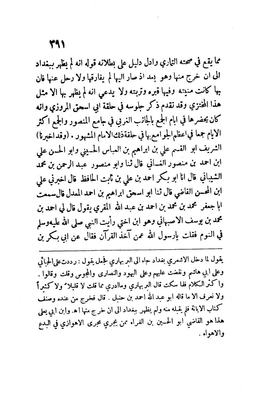 مِمَّا يَقع فِي صِحَّته التماري وأدل دَلِيل على بُطْلَانه قَوْله إِنَّه لم يظْهر بِبَغْدَادَ إِلَى أَن خرج مِنْهَا وَهُوَ بعد إِذْ صَار إِلَيْهَا لم يفارقها وَلَا رَحل عَنْهَا فَإِن بهَا كَانَت منيته وفيهَا قَبره وتربته وَلَا يَدعِي أَنه لم يظْهر بهَا إِلَّا مثل هَذَا المختزي وَقد تقدم ذكر جُلُوسه فِي حَلقَة أبي اسحق المرزوي وَأَنه كَانَ يحضرها فِي أَيَّام الْجمع بالجانب الغربي فِي جَامع الْمَنْصُور ووالجمع أَكثر الْأَيَّام جمعا فِي أعظم الْجَوَامِع بهَا فِي حَلقَة ذَلِك الإِمَام الْمَشْهُور