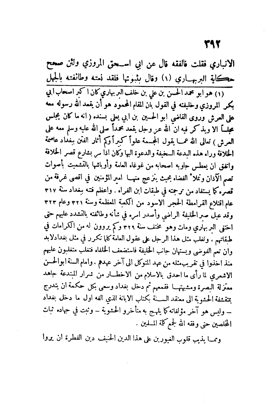 الأَنْبَارِيِّ فَقُلْتُ فَالْفِقْهَ قَالَ عَنْ أبي اسحق المرزوي وَلَئِن صحّح حِكَايَة البربهاري وَقَالَ بثبوتها فَلَقَد نَعته وطائفته بِالْجَهْلِ