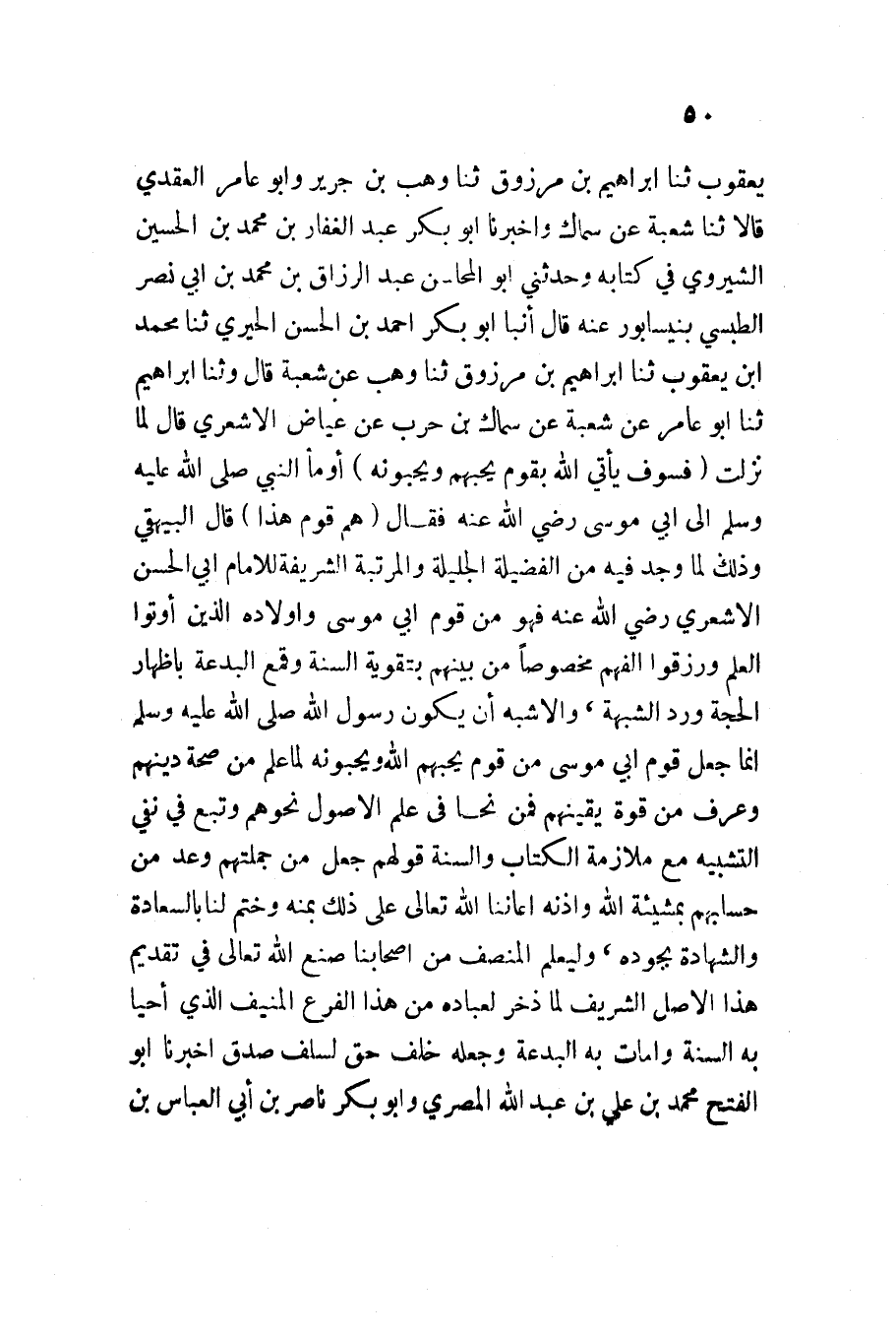 هَمْ قَوْمُ هَذَا قَالَ الْبَيْهَقِيّ وَذَلِكَ لما وجد فِيهِ من الْفَضِيلَة الجليلة والمرتبة الشَّرِيفَة للْإِمَام أَبِي الْحسن الْأَشْعَرِيّ رَضِيَ اللَّهُ عَنْهُ فَهُوَ من قوم أَبِي مُوسَى وَأَوْلَاده الَّذين أُوتُوا الْعلم ورزقوا الْفَهم مَخْصُوصًا من بَينهم بتقوية السّنة وقمع الْبِدْعَة بِإِظْهَار الْحجَّة ورد الشُّبْهَة وَالْأَشْبَه أَن يكون رَسُول اللَّه صَلَّى عَلَيْهِ وَسَلَّمَ إِنَّمَا جعل قوم أَبِي مُوسَى من قوم يُحِبهُمْ اللَّه وَيُحِبُّونَهُ لما علم من صِحَة دينهم وَعرف من قُوَّة يقينهم فَمن نحا فِي علم الْأُصُول نحوهم وَتبع فِي نفى التَّشْبِيه مَعَ مُلَازمَة الْكتاب وَالسّنة قَوْلهم جعل من جُمْلَتهمْ وعد من حسابهم بِمَشِيئَة اللَّه وإذنه أعاننَا اللَّه تَعَالَى على ذَلِك بمنه وَختم لنَا بالسعادة وَالشَّهَادَة بجوده وليعلم الْمنصف من أصحابِنَا صنع اللَّه تَعَالَى فِي تَقْدِيم هَذَا الأَصْل الشريف لما ذخر لِعِبَادِهِ من هَذَا الْفَرْع المنيف الَّذِي أَحْيَا بِهِ السّنة وأمات بِهِ الْبِدْعَة وَجعله خلف حق السّلف صدق أَخْبَرَنَا أَبُو الْفَتْحِ مُحَمَّدُ بْنُ عَلِيِّ بْنِ عَبْدِ اللَّهِ الْمِصْرِيِّ وَأَبُو بَكْرٍ نَاصِرُ بْنُ أَبِي الْعَبَّاسِ بْنِ