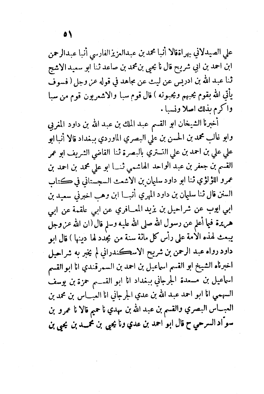إِنَّ اللَّهَ عزوجل يَبْعَثُ لِهَذِهِ الأُمَّةِ عَلَى رَأْسِ كُلِّ مِائَةٍ سَنَةٍ مَنْ يُجَدِّدُ لَهَا دِينَهَا قَالَ أَبُو دَاوُدَ رَوَاهُ عَبْدُ الرَّحْمَنِ بْنُ شُرَيْحٍ الإِسْكَنْدَرَانِيُّ لَمْ يُخْبِرْ بِهِ شُرَاحِيلَ أخبرناه الشَّيْخ أَبُو الْقسم إِسْمَاعِيلُ بْنُ أَحْمَدَ بْنِ السَّمَرْقَنْدِيِّ انا أَبُو الْقسم إِسْمَاعِيلُ بْنُ مَسْعَدَةَ الْجُرْجَانِيُّ بِبَغْدَادَ أَنا أَبُو الْقسم حَمْزَة بن يُوسُف السَّهْمِي أَنا أَبُو أَحْمَدَ عَبْدُ اللَّهِ بْنُ عدي الْجِرْجَانِيّ انا الْعَبَّاسُ بْنُ مُحَمَّدِ بْنِ الْعَبَّاسِ الْبَصْرِيّ وَالْقسم بْنُ عَبْدِ اللَّهِ بْنِ مَهْدِيٍّ نَا حميم قَالا نَا عَمْرُو بْنُ سَوَادٍ السرحي ح قَالَ أَبُو أَحْمَدَ بْنُ عَدِيٍّ ونا يَحْيَى بْنُ مُحَمَّدِ بْنِ يَحْيَى بن