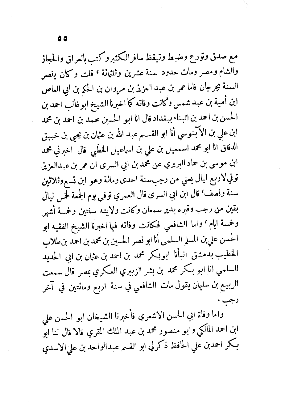 مَعَ صدق وتورَّع وَضبط وتيقظ سَافر الْكثير وَكتب بالعراق والحجاز وَالشَّام ومصر وَمَات حُدُود سنة عشْرين وثلثمائة قلت وَكَانَ ينصر السّنة بجرجان فَأَما عمر بن عَبْدِ الْعَزِيزِ بن مَرْوَان بن الحكم بن أبي الْعَاصِ ابْن أُميَّة بن عَبْدِ شمس وَكَانَت وَفَاته كَمَا أَخْبَرَنَا الشَّيْخُ أَبُو غَالب أَحْمد بن الْحَسَنِ بن أَحْمَدَ بن الْبناء بِبَغْدَاد قَالَ أَنا أَبُو الْحُسَيْنِ مُحَمَّدُ بْنُ أَحْمَدَ بن مُحَمَّدِ بْنِ عَلِيِّ بْنِ الآبنوسي انا ابو الْقسم عَبْد اللَّهِ بن عُثْمَانَ بن يحيى بن خبيق الدقاق أَنا أَبُو مُحَمَّد اسمعيل بن عَلِيِّ بْنِ إِسْمَاعِيل الخطبي قَالَ أَخْبرنِي مُحَمَّد ابْن مُوسَى بن حَمَّاد الْبَرْبَرِي عَنْ مُحَمَّدِ بْنِ أَبِي السّري أَن عمر بن عَبْدِ الْعَزِيزِ توفّي لأَرْبَع لَيَال يَعْنِي من رَجَب سنة إِحْدَى وَمِائَة وَهُوَ ابْن تسع وَثَلَاثِينَ سنة وَنصف قَالَ ابْن أبي السّري قَالَ الْعمريّ توفّي يَوْم الْجُمُعَة لخمس لَيَال بَقَين من رَجَب وقبره بدير سمْعَان وَكَانَت ولَايَته سنتَيْن وَخَمْسَة أشهر وَخَمْسَة أَيَّام وَأما الشَّافِعِي فَكَانَت وَفَاته فِيمَا أَخْبَرَنَا الشَّيْخُ الْفَقِيه أَبُو الْحَسَنِ عَلِيُّ بن الْمُسلم السّلمِيّ أَنا أَبُو نصر الْحُسَيْن بن مُحَمَّدِ بْنِ أَحْمَدَ بن طلاب الْخَطِيب بِدِمَشْقَ أنبأنَا أَبُو بكر مُحَمَّد بن أَحْمَدَ بن عُثْمَانَ بن ابي الْحَدِيد السّلمِيّ انا أَبُو بكر مُحَمَّد بن بشر الزبيرِي العكري بِمصْر قَالَ سَمِعت الرّبيع بن سُلَيْمَان يَقُول مَاتَ الشَّافِعِي فِي سنة أَربع وَمِائَتَيْنِ فِي آخر رَجَب