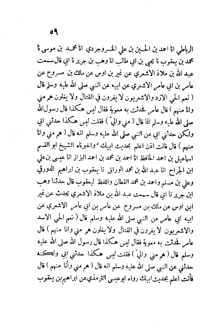 هُمْ مِنِّي وَأَنَا مِنْهُمْ قَالَ فَأَنْتَ إِذَنْ أَعْلَمُ بِحَدِيثِ أَبِيكَ وأخبرناه الشَّيْخ أَبُو الْقسم اسماعيل بن أَحْمد الْحَافِظ أَنا أَحْمَدُ بْنُ مُحَمَّدِ بْنِ أَحْمَدَ الْبَزَّاز أَنا عِيسَى بن عَليّ ابْن الْجراح أَنا عَبْدُ اللَّهِ بْنُ مُحَمَّدٍ الْوَرَّاقُ نَا يَعْقُوبُ بْنُ إِبْرَاهِيمَ الدَّوْرَقِيُّ وَعَلِيُّ بْنُ مُسْلِمٍ وَأَحْمَدُ بْنُ مُحَمَّدٍ الْقَطَّانُ وَاللَّفْظُ لِيَعْقُوبَ قَالَ حَدثنَا وهب ابْن جَرِيرٍ نَا أَبِي قَالَ سَمِعْتُ عَبْدَ اللَّهِ بْنَ مَلاذٍ الأَشْعَرِيَّ يحدث عَن نمير ابْن أَوْسٍ عَنْ مَالِكِ بْنِ مَسْرُوحٍ عَنْ عَامِرِ بْنِ أَبِي عَامِرِ الأَشْعَرِيِّ عَنْ أَبِيهِ أَبِي عَامِرٍ عَنِ النَّبِيِّ صَلَّى اللَّهُ عَلَيْهِ وَسَلَّمَ قَالَ