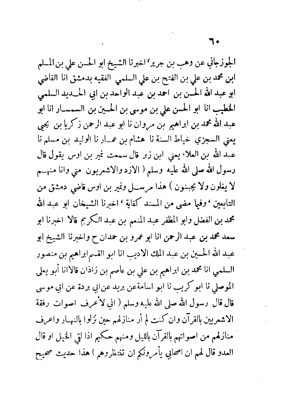 الْجُوْزَجَانِيِّ عَنْ وَهْبِ بْنِ جَرِيرٍ أَخْبَرَنَا الشَّيْخُ أَبُو الْحَسَنِ عَلِيُّ بن الْمُسلم ابْن مُحَمَّدِ بْنِ عَلِيِّ بْنِ الْفَتْحِ بْنِ عَلِيٍّ السُّلَمِيِّ الْفَقِيهُ بِدِمَشْقَ أَنا الْقَاضِي أَبُو عَبْدِ اللَّهِ الْحَسَنُ بْنُ أَحْمَدَ بْنِ عَبْدِ الْوَاحِدِ بْنِ أَبِي الْحَدِيدِ السُّلَمِيُّ الْخَطِيبُ انا أَبُو الْحَسَنِ عَلِيُّ بْنُ مُوسَى بن الْحُسَيْن بن السمسار أَنا أَبُو عَبْدِ اللَّهِ مُحَمَّدُ بْنُ إِبْرَاهِيمَ بْنِ مَرْوَانَ نَا أَبُو عَبْدِ الرَّحْمَنِ زَكَرِيَّا بْنُ يَحْيَى يَعْنِي السِّجْزِيُّ خَيَّاطُ السُّنَّةِ نَا هِشَامُ بْنُ عَمَّارٍ نَا الْوَلِيدُ بْنُ مُسْلِمٍ نَا عَبْدُ اللَّهِ بْنُ الْعَلاءِ يَعْنِي ابْنُ زَبْرٍ