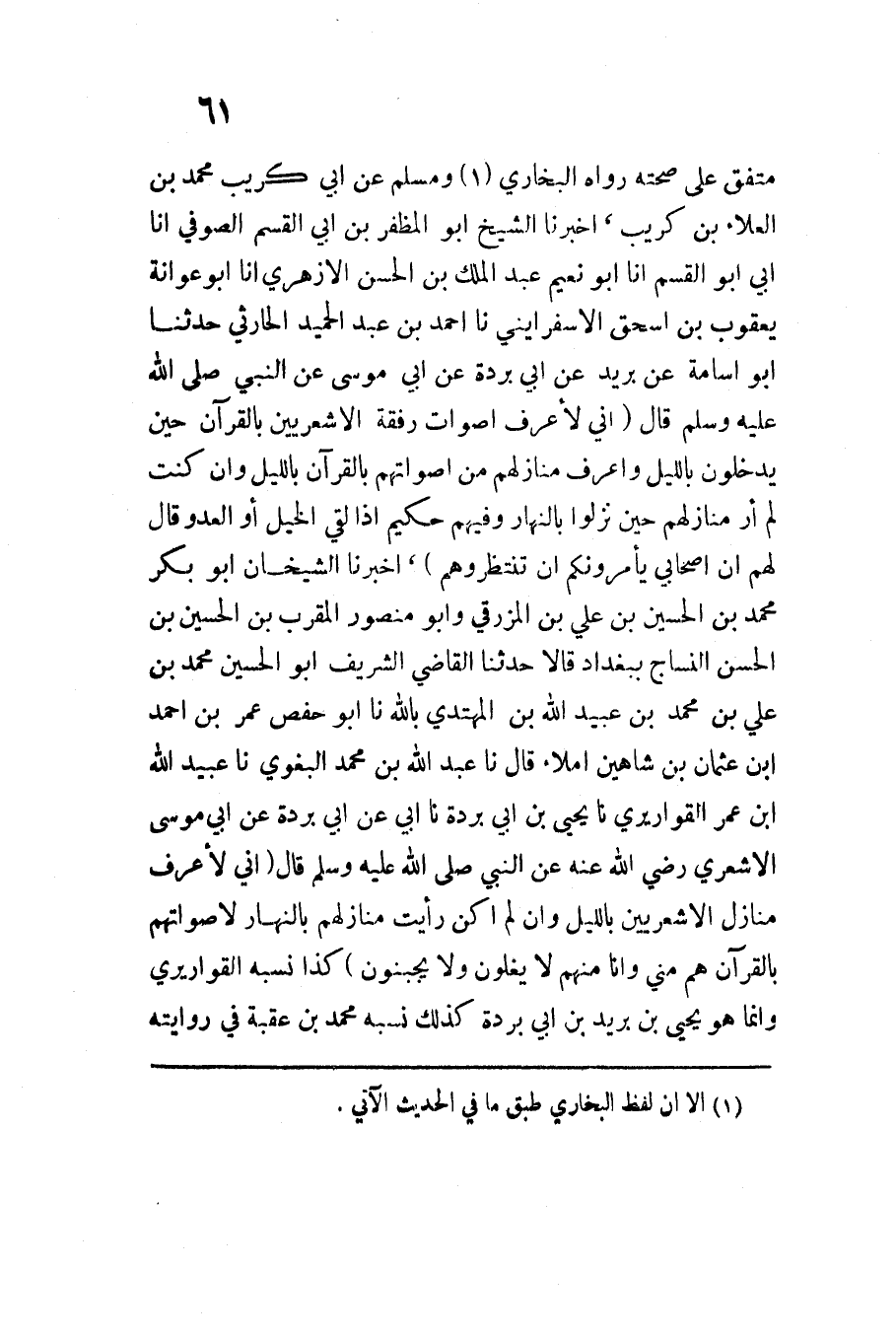 مُتَّفَقٌ عَلَى صِحَّتِهِ رَوَاهُ الْبُخَارِيُّ وَمُسْلِمٌ عَنْ أَبِي كُريْبٍ مُحَمَّدُ بْنُ الْعَلاءِ بْنِ كُرَيْبٍ أَخْبَرَنَا الشَّيْخُ أَبُو الْمُظَفَّرِ بْنُ أَبِي الْقسم الصُّوفِي أَنا أبي أَبُو الْقسم أَنا أَبُو نُعَيْمٍ عَبْدُ الْمَلِكِ بْنِ الْحسن الْأَزْهَرِي أَنا أَبُو عوَانَة يَعْقُوب بن اسحق الإسفرايني نَا أَحْمَدُ بْنُ عَبْدِ الْحَمِيدِ الْحَارِثِيُّ حَدَّثَنَا أَبُو أُسَامَةَ عَنْ بُرَيْدٍ عَنْ أَبِي بُرْدَةَ عَنْ أَبِي مُوسَى عَنِ النَّبِيِّ صَلَّى اللَّهُ عَلَيْهِ وَسَلَّمَ قَالَ
